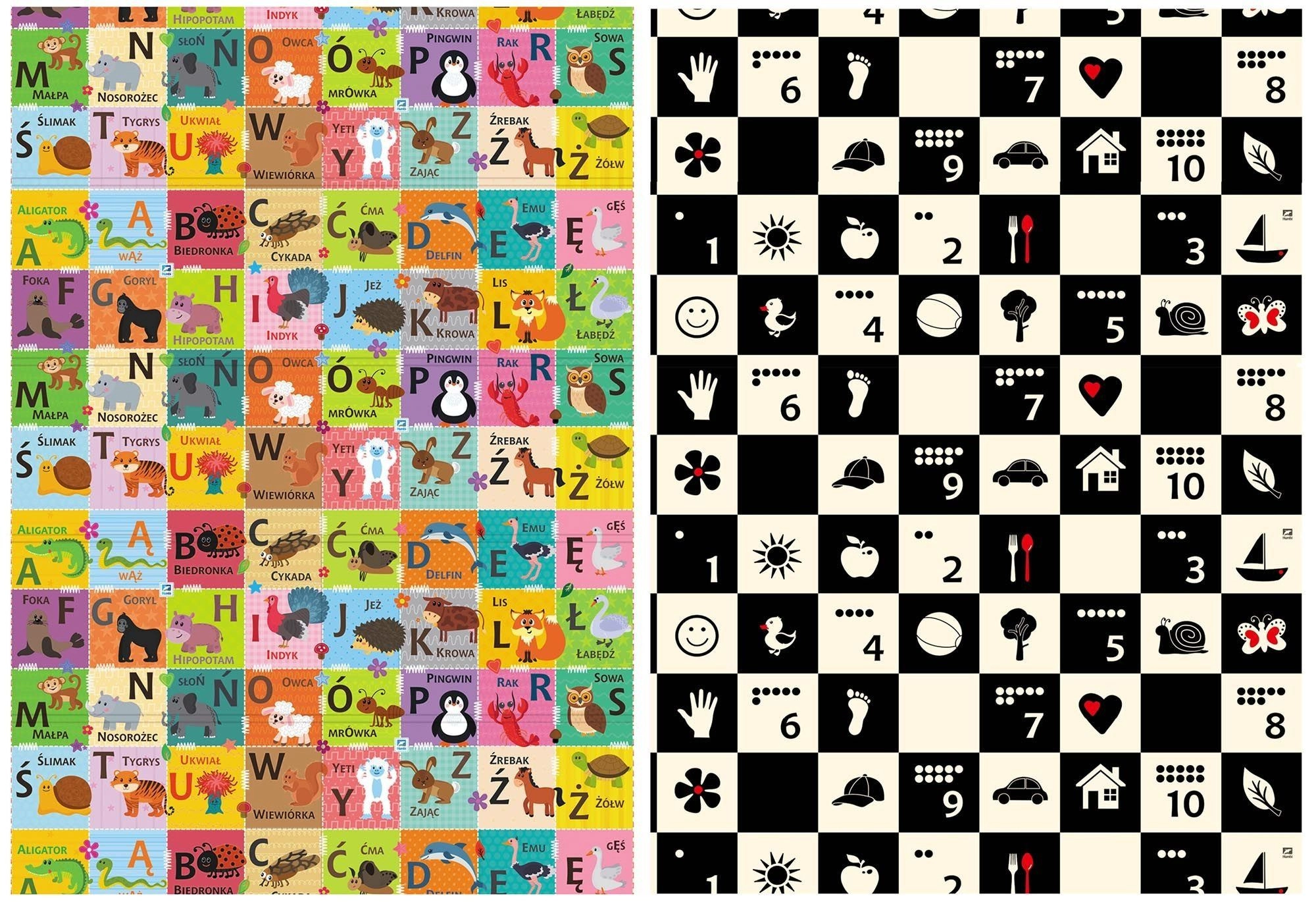 • Dubbelzijdig ontwerp: contrastrijke cijfers en symbolen + kleurrijk alfabet met dieren