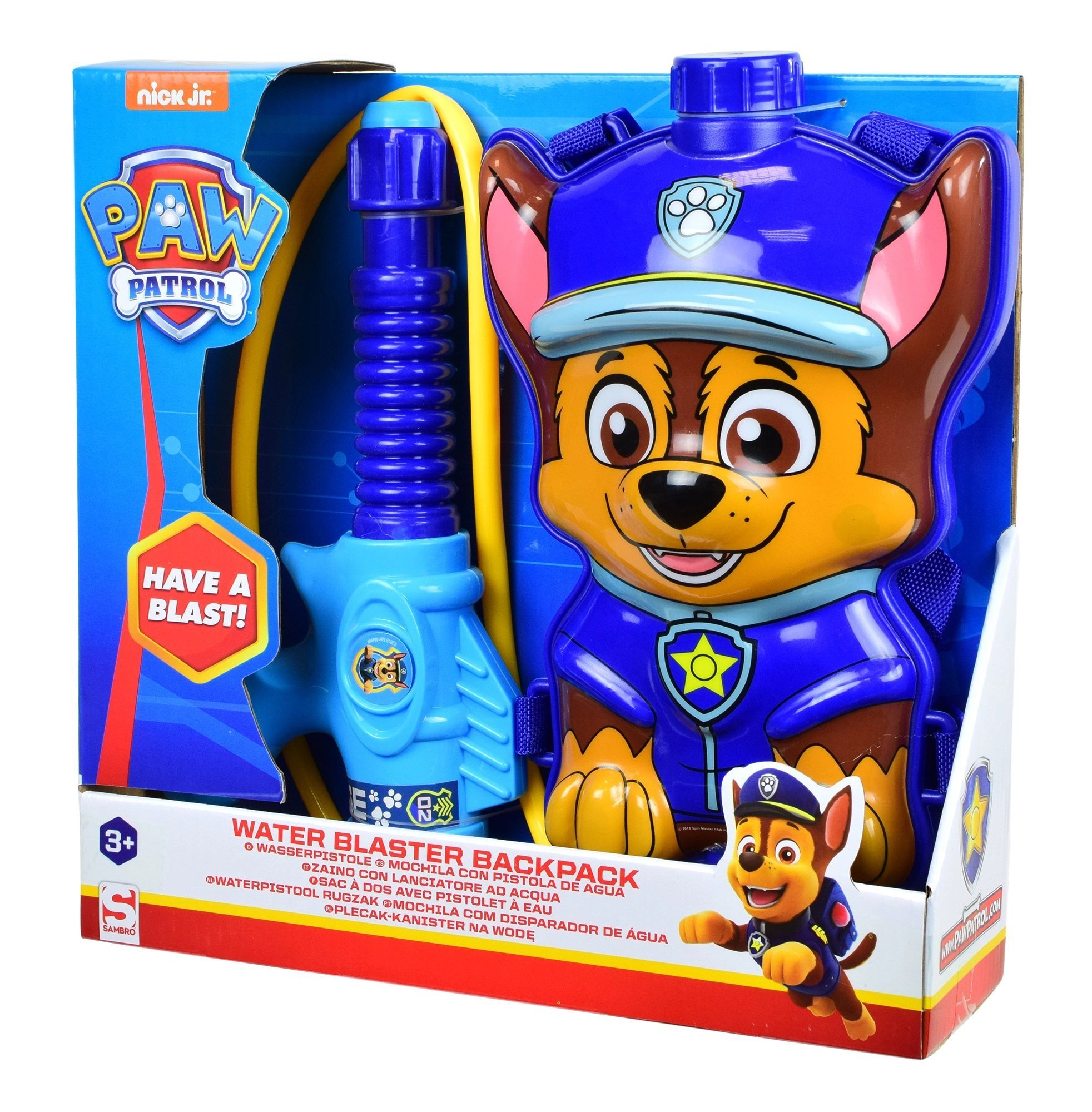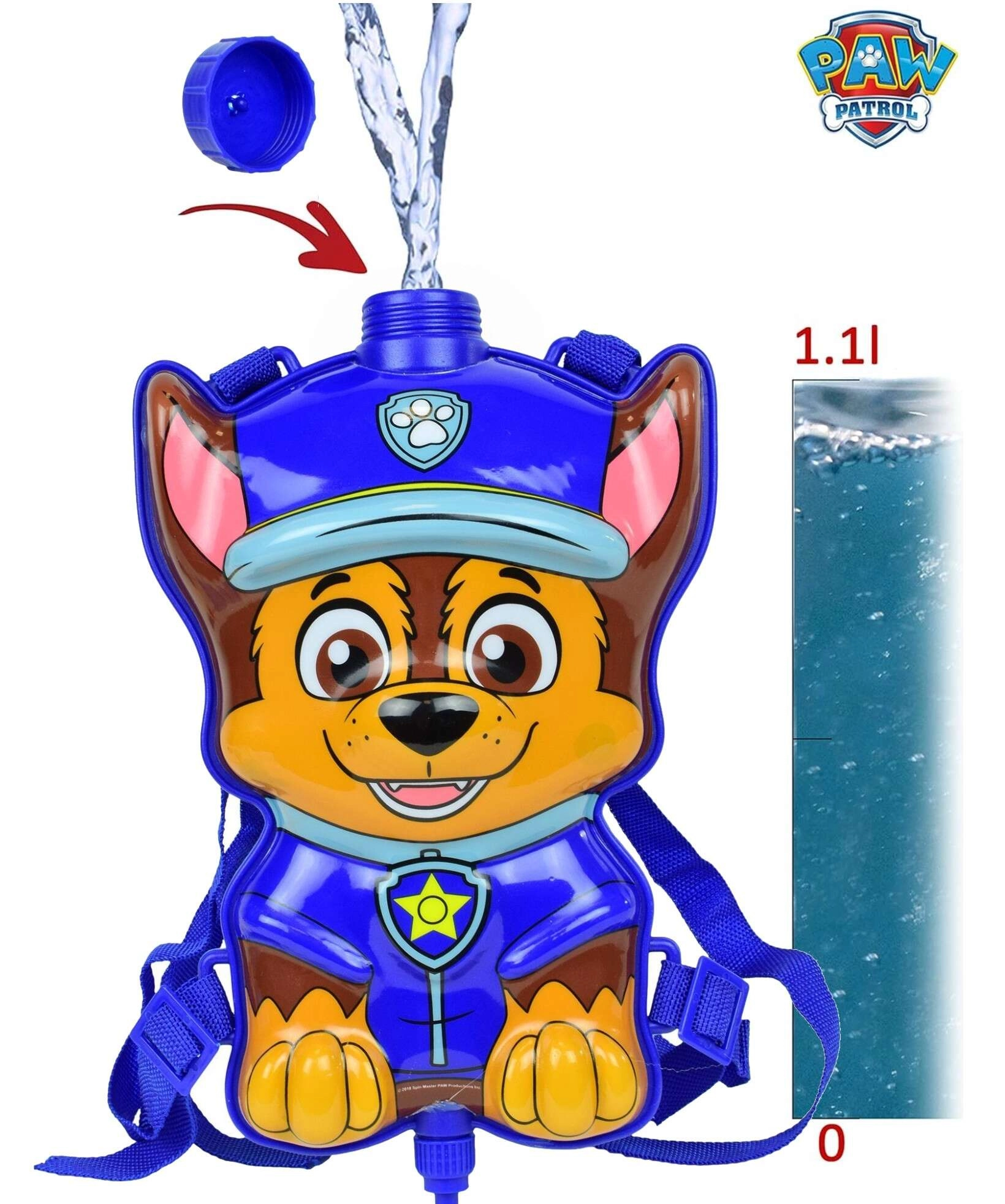 Leuke waterrugzak met het personage Chase uit de serie Paw Patrol voor eindeloos zomers speelplezier. Het rugzakje heeft verstelbare schouderbanden, een afsluitbare vulopening en is verbonden met een slangetje en een handwaterpistool met pomp. Ideaal voor in de tuin, bij het water of op de speelplaats.