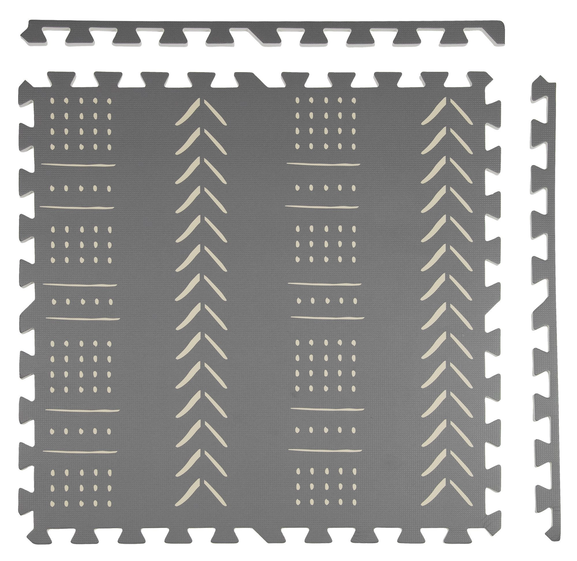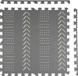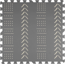 De stijlvolle en praktische HUMBI kinderspeelmat van schuim bestaat uit 3 grote tegels van 60 × 60 cm en 6 randen. Biedt een zachte ondergrond om te spelen, uitstekende isolatie tegen kou, is waterdicht, anti-slip en makkelijk te reinigen. Bevat geen schadelijke stoffen en voldoet aan de normen EN 71 en REACH. Subtiele grijze boho patronen passen in elk interieur.