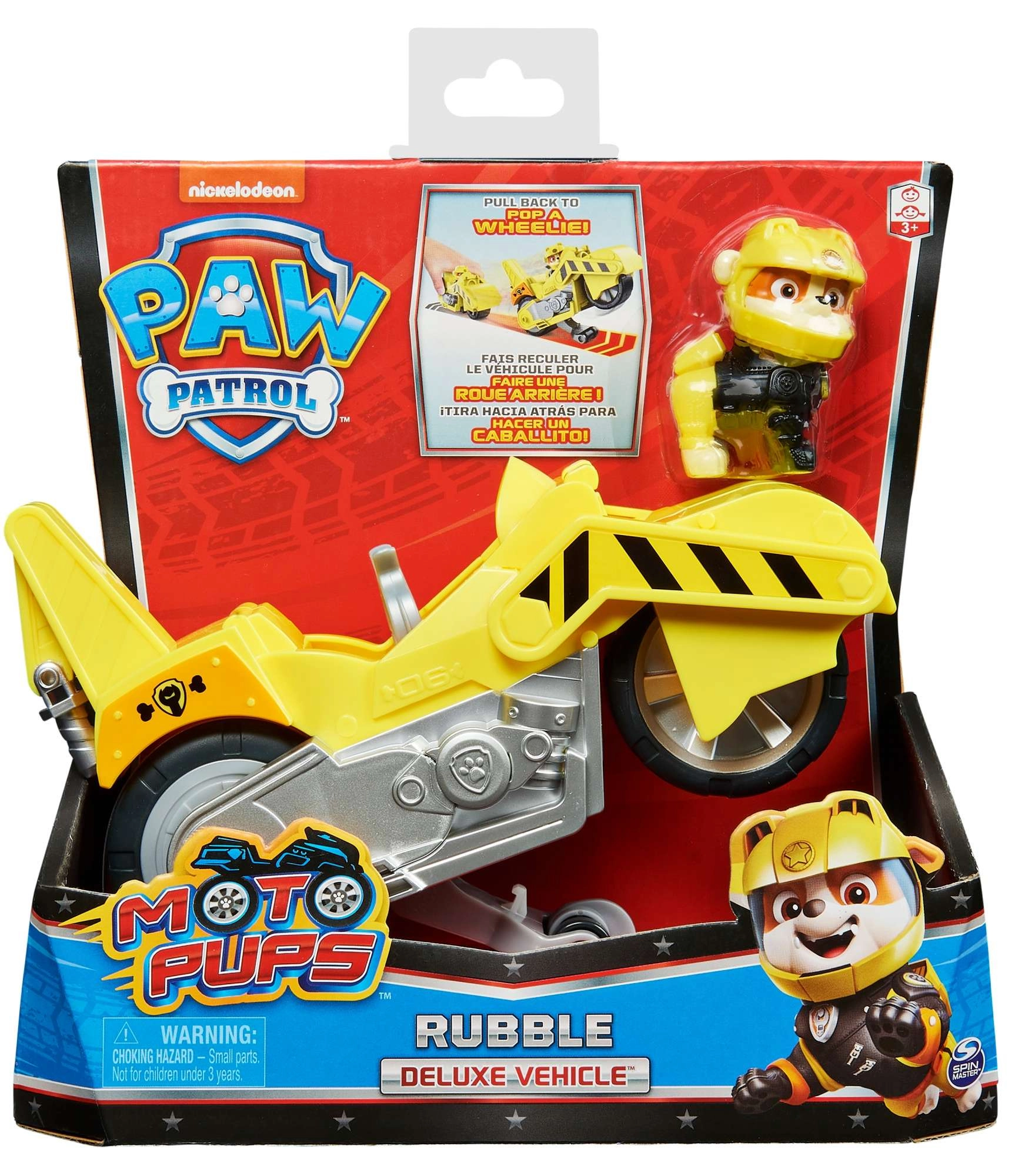 Trek eropuit naar de bouwplaats of op reddingsmissie met bulldog Rubble en zijn gele stuntmotor uit de Moto Pups-serie. De robuuste afwerking, opvallende gele details en grote wielen zorgen voor uitstekende stabiliteit, terwijl het pull-back mechanisme kinderen veel snelle pret bezorgt.