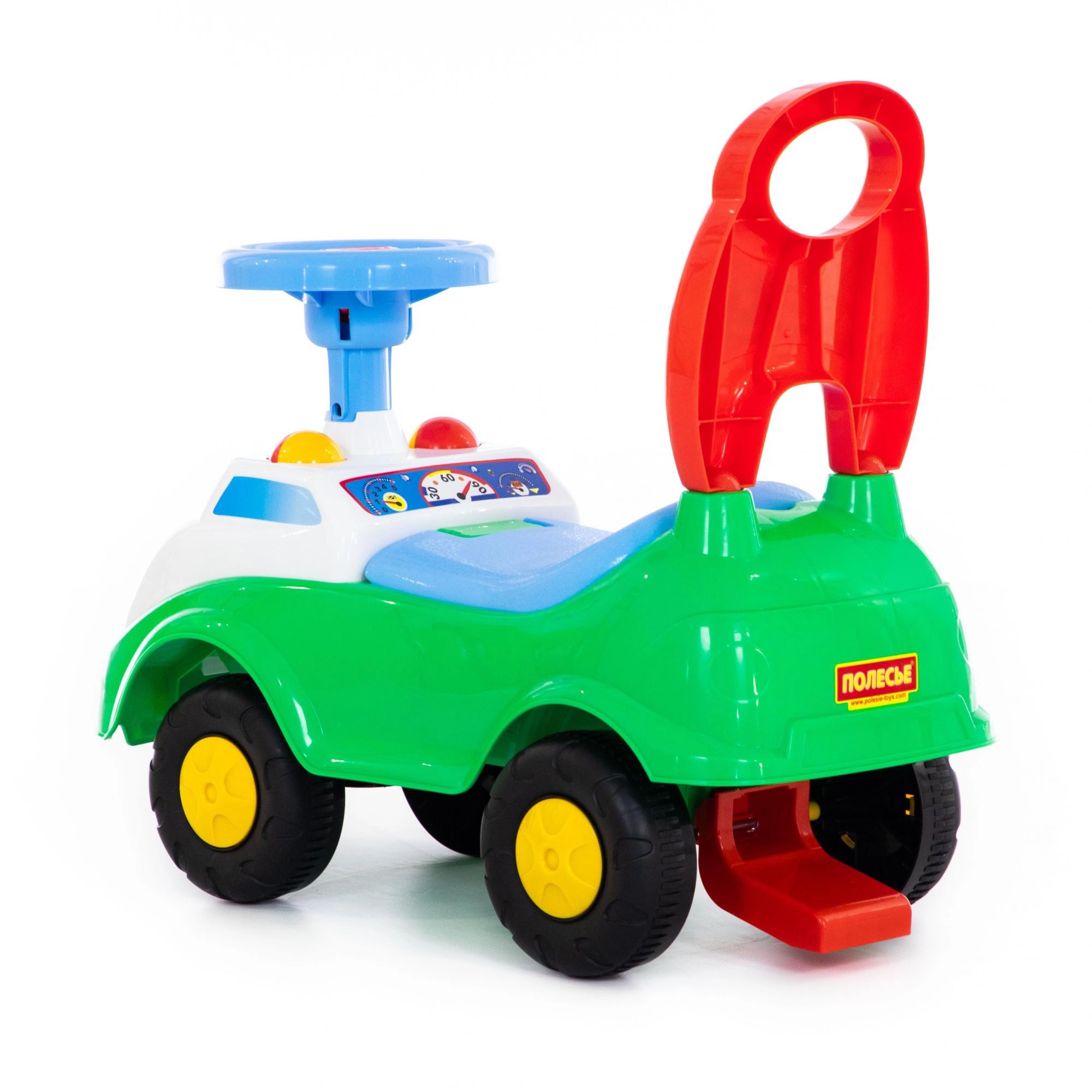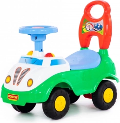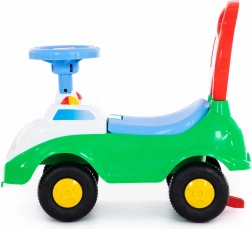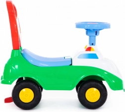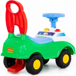 Het stuur met geluidsmodule zorgt voor extra plezier en motiveert kinderen om langer te spelen. De achterste rugleuning kan worden gebruikt als handvat – het kind kan zich vasthouden, de loopauto voor zich uit duwen en zo coördinatie en evenwicht trainen. De compacte afmetingen van 56 × 24 × 57 cm zijn ideaal voor zowel appartement als tuin.