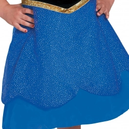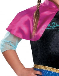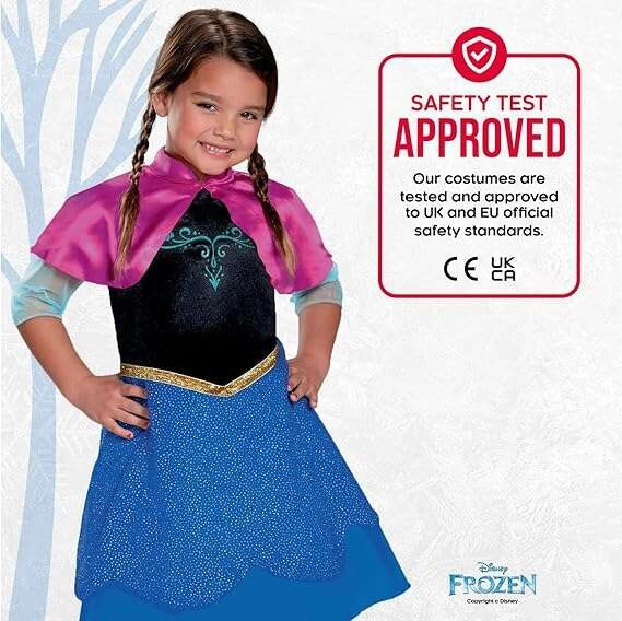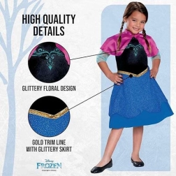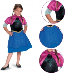 Inbegrepen zijn een jurk in blauwe en satijnzwarte tinten en een korte roze cape, waardoor de look trouw blijft aan het personage Anna. Het kostuum is bedoeld voor kinderen van 5–6 jaar en past bij een lengte van 109–123 cm.