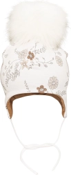 - Beige bloemenprint, grote faux-fur pompon