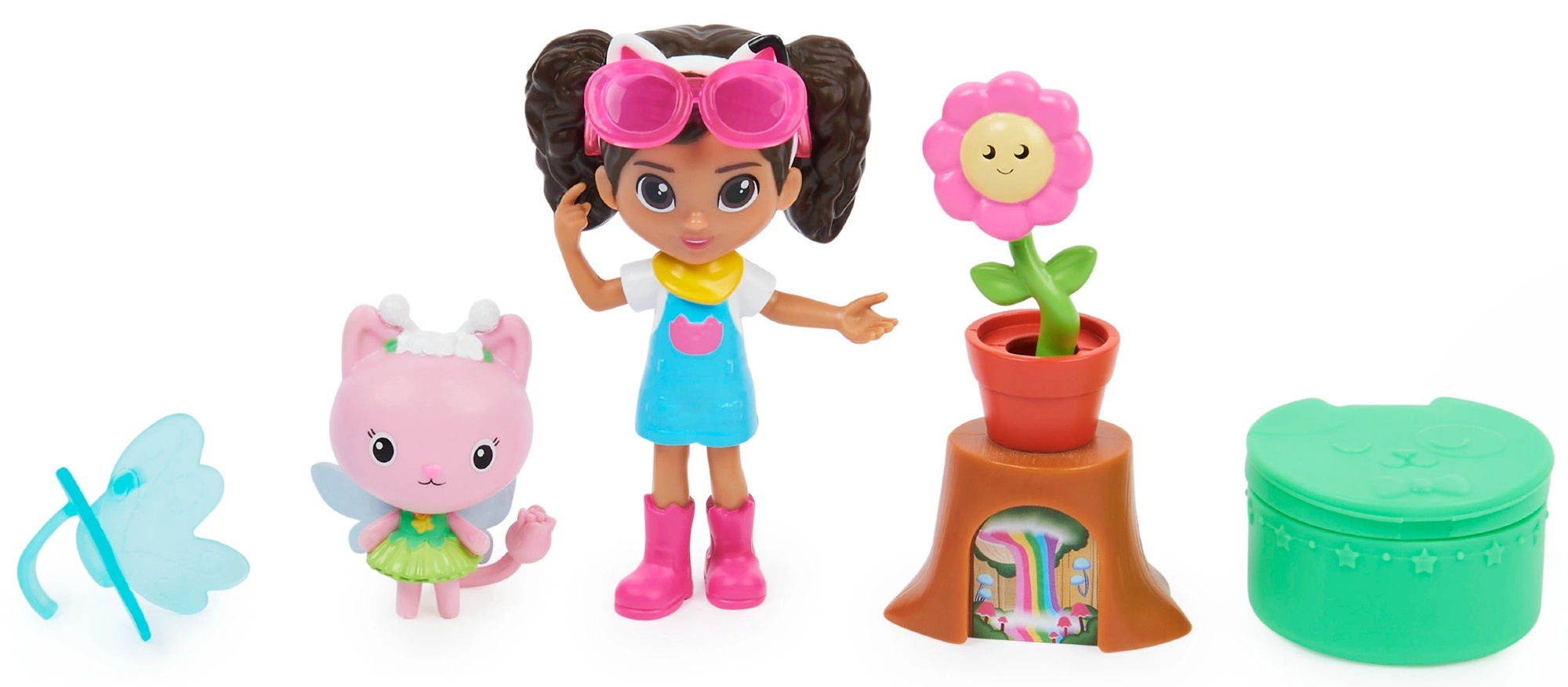 Deze schattige set neemt kinderen mee in de wereld van Gabby’s Dollhouse. Gabi draagt haar iconische haarband met kattenoortjes, roze bril en kleurrijke outfit. Bij het indrukken van haar hoofd zakt de bril magisch op haar neus of gaat weer omhoog, wat zorgt voor een extra interactieve dimensie. Ook inbegrepen zijn de feeënkat Kitty Fairy, een bloem in een bloempot en een geheim accessoire voor creatieve tuinscènes.