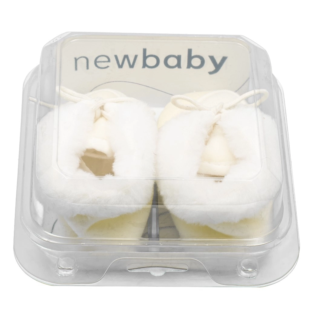 Stijlvolle winter-babyslofjes van New Baby met suède-look, perfect voor koude dagen thuis en voor wandelingen in de kinderwagen. Zachte textiele bovenkant, fleecevoering (100% polyester) en een licht gewatteerd voetbed zorgen voor warmte en comfort. De vetersluiting maakt het eenvoudig om de enkelomvang aan te passen en de slofjes op hun plaats te houden.
