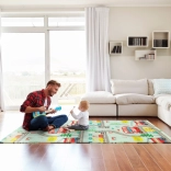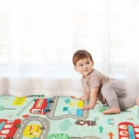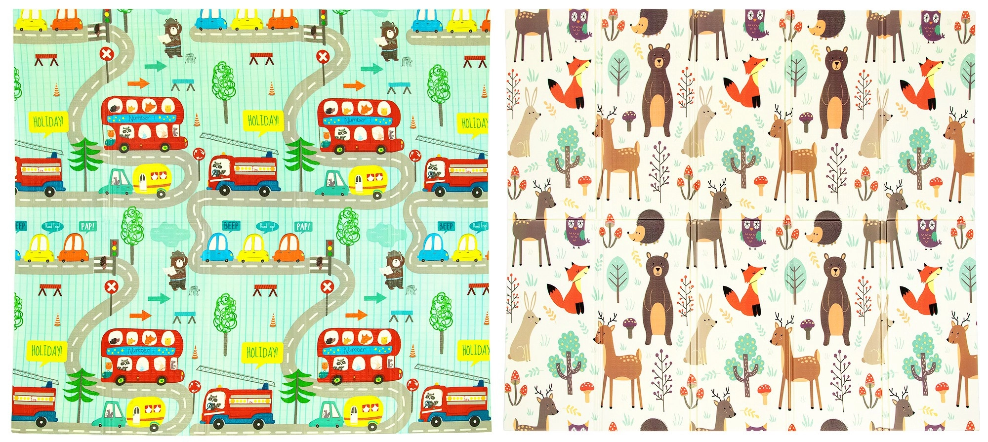 De mat is dubbelzijdig: aan de ene kant zachte motieven van bosdieren, aan de andere kant vrolijke kleurrijke straatjes. Hij is gemakkelijk op te vouwen tot een compact formaat, licht en dankzij de ritstas met handgrepen neem je hem mee naar de woonkamer, kinderkamer, tuin of picknick. Het waterdichte oppervlak veeg je eenvoudig af met een vochtige doek – een hygiënische oplossing, ook geschikt voor mensen met een allergie.