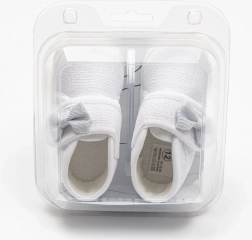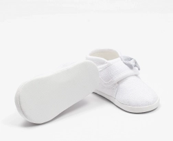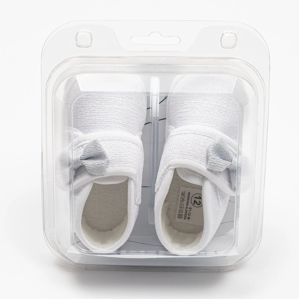 Schattige babycribs NEW BABY in het wit voor kinderen van 0–3 maanden met een lichte uitvoering, comfortabele brede binnenafwerking en eenvoudige klittenbandsluiting. Dankzij de dunne synthetische zool zijn ze niet bedoeld om mee te lopen, maar ze houden de voetjes van je baby heerlijk warm en beschermd.