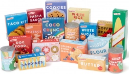 Kleurige doosjes en blikjes met opdrukken van koekjes, meel, bonen en soep stimuleren de verbeelding en thematisch winkelfantasiespel.