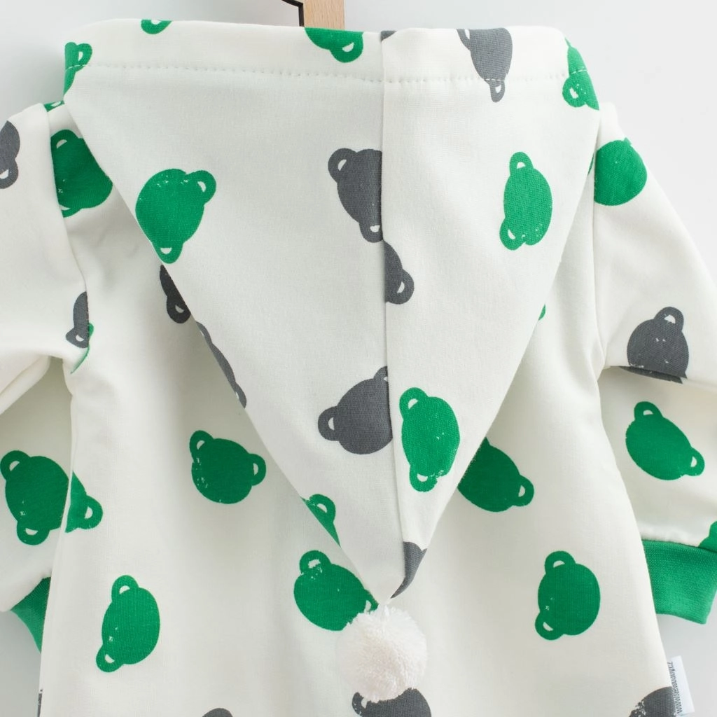 Schattige en praktische babyoverall met capuchon NEW BABY Little One die zowel comfortabel als stijlvol is. Met een all-over berenprint, een rits over de hele lengte voor gemakkelijk aan- en uitkleden, elastische boorden aan mouwen en pijpen en een capuchon met gekleurde voering en pompon. Gemaakt van aangename joggingstof, ideaal voor het hele jaar door dragen.