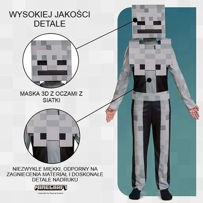 Verander je kleine speler in een gevreesde tegenstander uit de wereld van Minecraft! Het Skeleton-kostuum in de witte variant kopieert trouw het uiterlijk van het gamepersonage en is een geweldige keuze voor schoolcarnaval, verkleedbal en themafeesten. Dankzij het lichte materiaal draagt het comfortabel en biedt het kinderen vrije beweging tijdens het spelen.