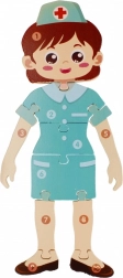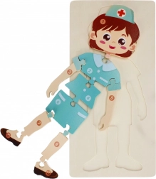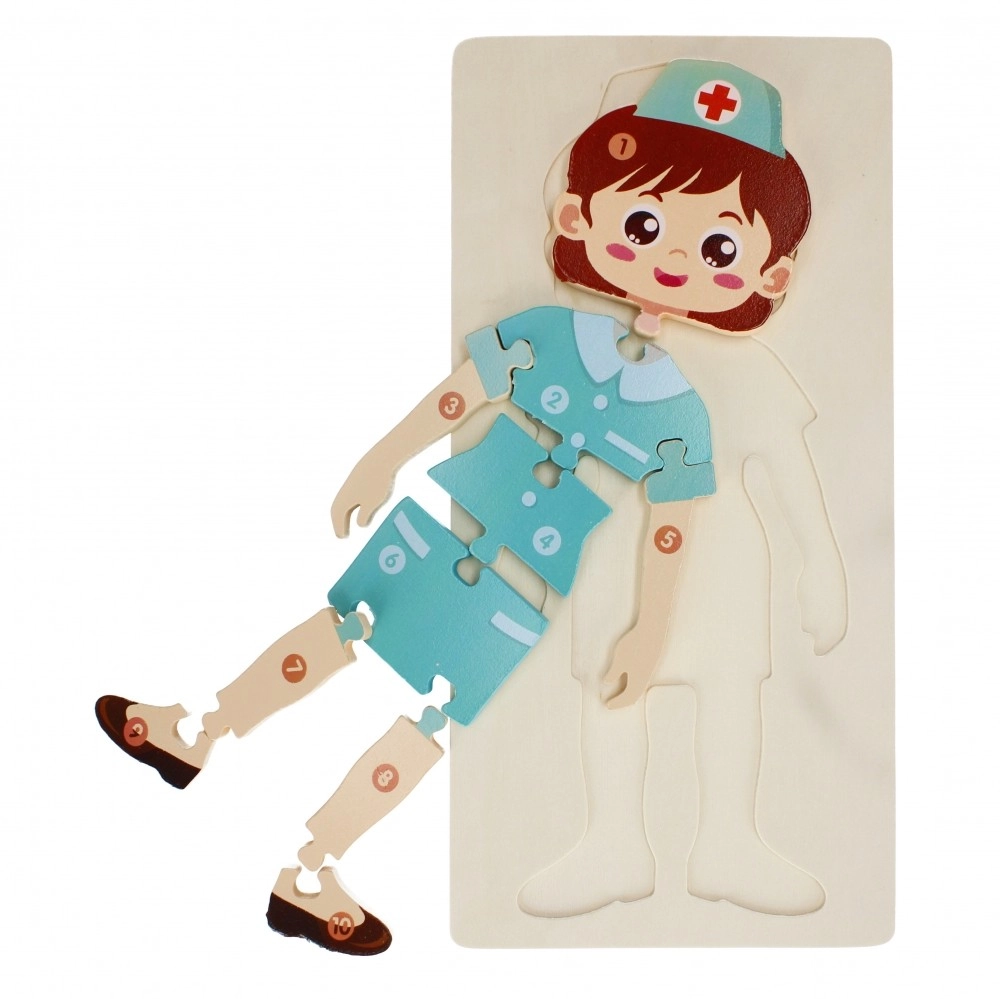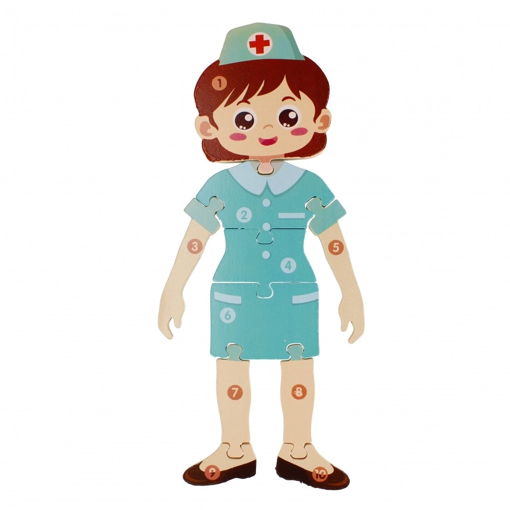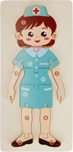 De houten puzzel Verpleegster is een ideale educatieve speelgoed voor kleuters. De stukjes in de vorm van een verpleegsterfiguurtje helpen de fijne motoriek, oog-handcoördinatie en logisch denken te ontwikkelen. Dankzij het aangename houtmateriaal en de afgeronde randen is het leggen comfortabel en veilig.