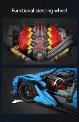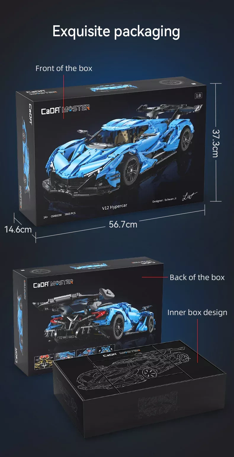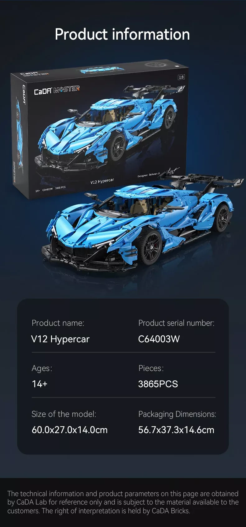 Dit grootschalige V12-hypercarmodel uit de CADA Master-serie zal alle fans van technische bouwsets bekoren. Tijdens het bouwen geniet u van doordachte mechanische elementen die de realistische beleving versterken: van functionele besturing en openende deuren tot authentieke cockpitdetails. Dankzij de elegante blauwe carrosserie wordt het een opvallend pronkstuk in elke collectie.