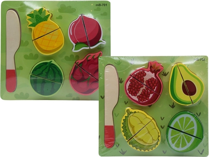 Je kunt kiezen uit twee fruitvarianten. De afzonderlijke delen blijven goed aan elkaar zitten, maar laten zich toch gemakkelijk scheiden met het houten mesje, wat een realistische “snij”-ervaring biedt zonder risico op verwondingen. Perfect voor thuis, de kinderopvang of als cadeau.