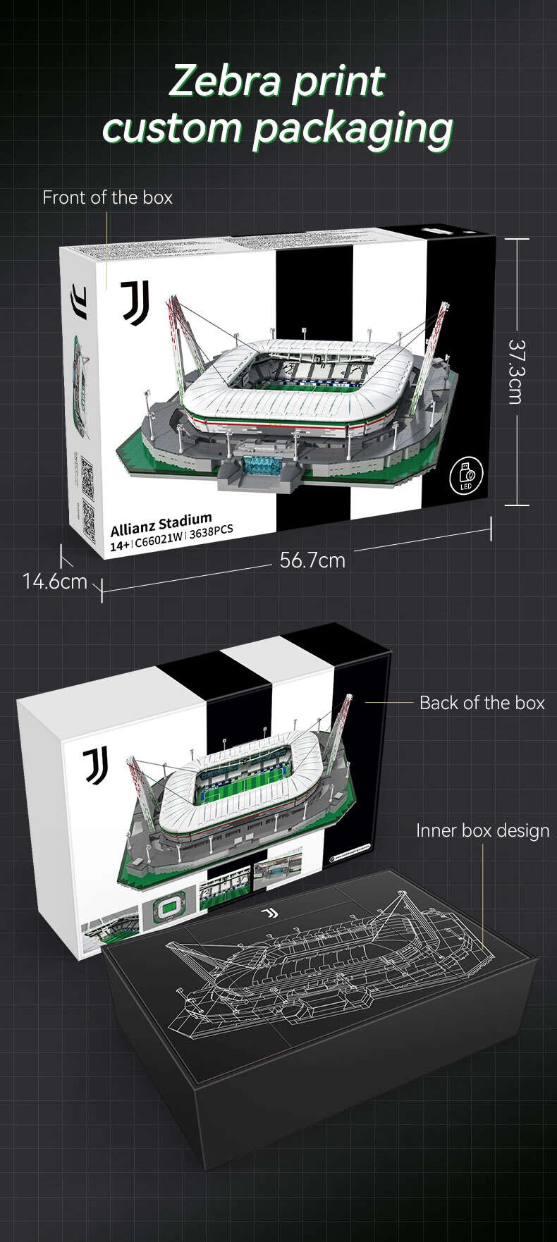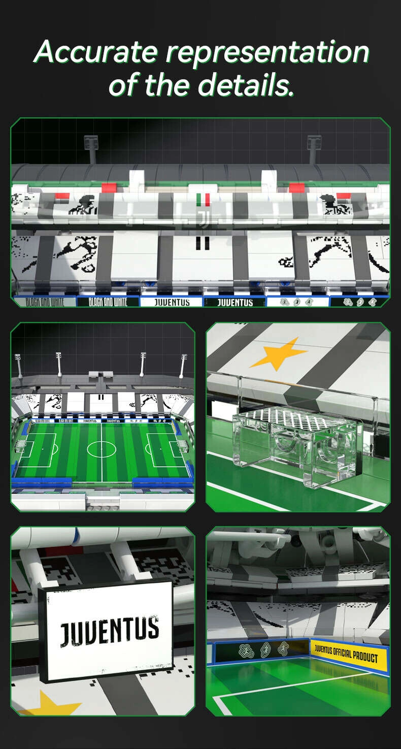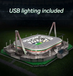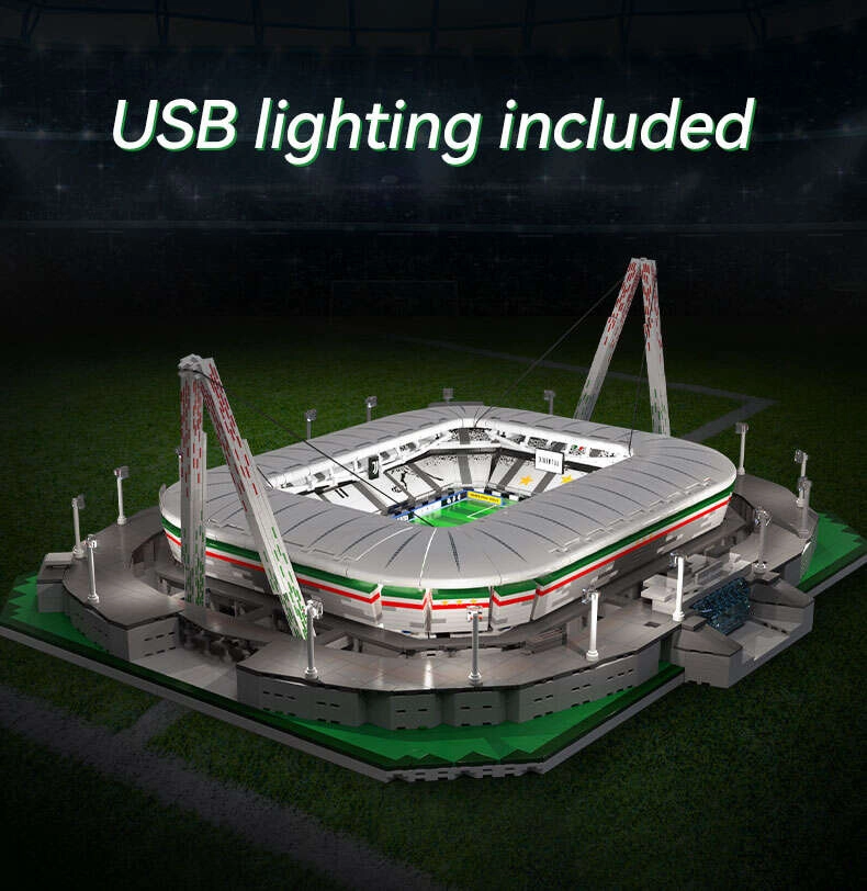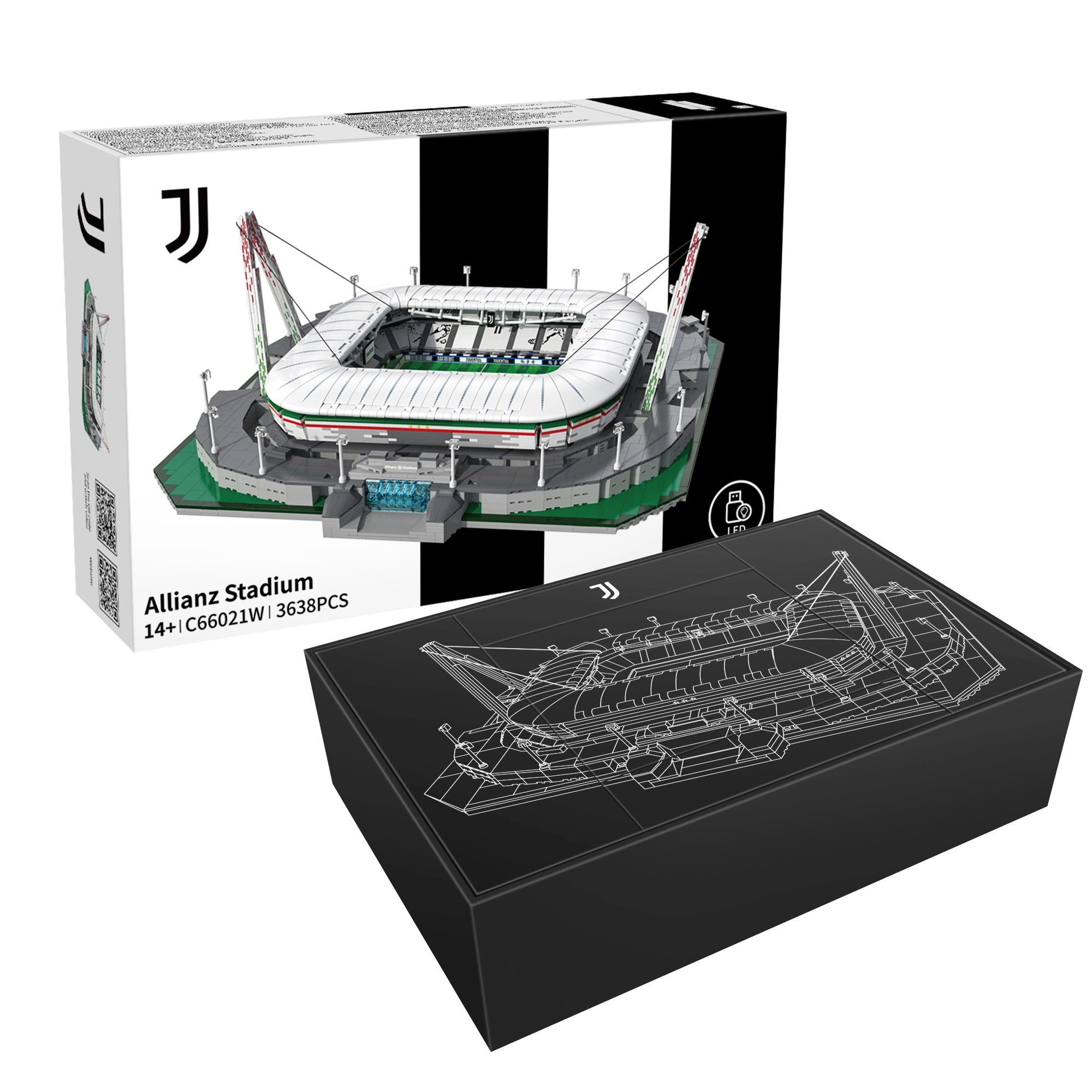 Bouw thuis een getrouwe replica van het Allianz Stadium in Turijn – de thuishaven van Italiaanse topvoetbal. De CaDA-set brengt indrukwekkende architectuur met een gemarkeerd speelveld, tribunes, ingangen, geveldetails en de kenmerkende dragende pylonen en kabels. Inclusief LED-lichtmodule met acht modi die het model tot een opvallend showstuk transformeert.