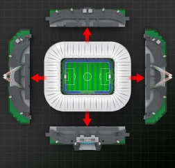 Zes los te koppelen secties – het veld, vier tribunes en het dak – maken snel uit elkaar halen en een gedetailleerde blik in het interieur mogelijk.