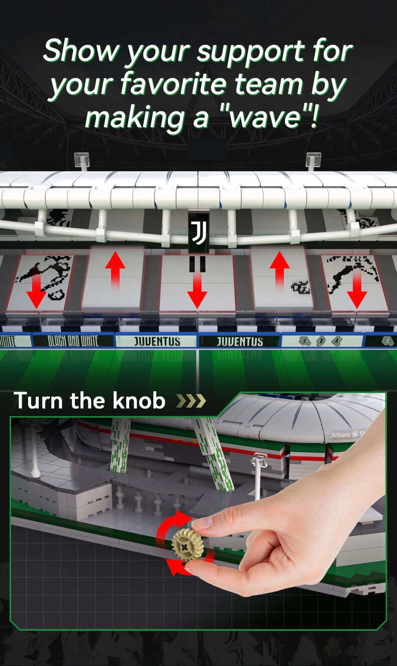 Het model is verdeeld in zes modules (veld, vier tribunes en dak), zodat je het gemakkelijk uit elkaar haalt en het interieur kunt bekijken. De unieke “wave”-functie laat via een draaiknop de stoelen op en neer bewegen – net als in een echt stadion. Dankzij het doordachte design en de stevige constructie is het ideaal om te bouwen, tentoon te stellen en te verzamelen.