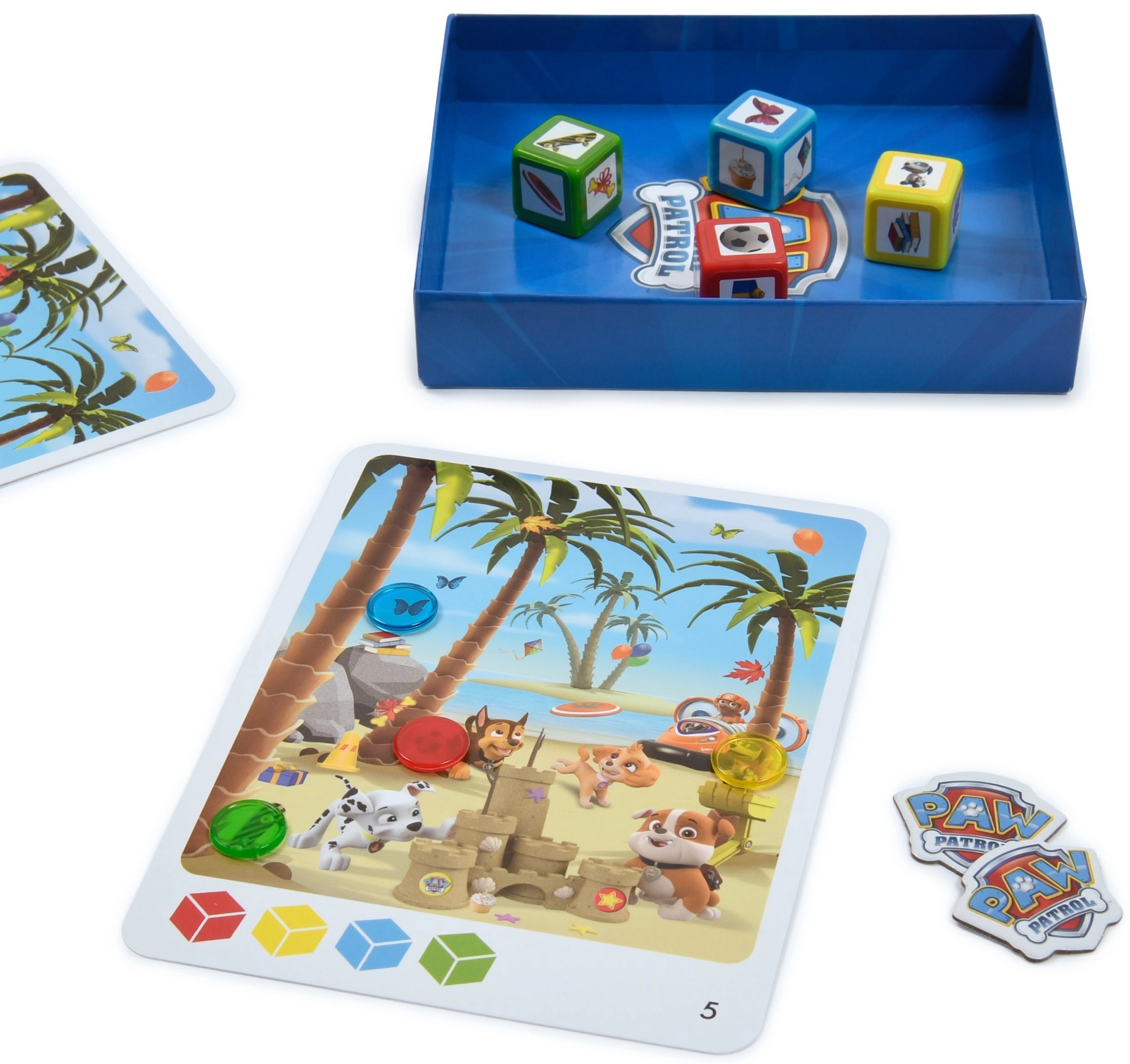 Geniet van een spannend observatiespel met de pups van PAW PATROL – CHASE, MARSHALL, RUBBLE, ROCKY, ZUMA en SKYE. Spelers gooien met de dobbelstenen en zoeken zo snel mogelijk de overeenkomende afbeeldingen op de kaarten. Wie als eerste alle gevonden symbolen markeert met gekleurde stippen, verdient een fiche. Aan het einde wint de speler met de meeste fiches. Het spel is ideaal voor kinderen en ouders en stimuleert reactievermogen, oog-handcoördinatie, geheugen en concentratie.