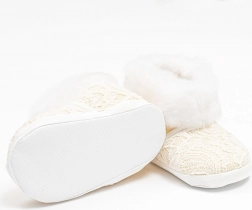 Deze slofjes zijn zeer licht en hebben een dunne synthetische PVC-zool zonder BPA, die zacht is en geschikt voor dagelijks gebruik in de kinderwagen of thuis. Ze zijn niet bedoeld om mee te lopen, maar houden de voetjes heerlijk warm en maken de winteroutfit van je baby compleet.