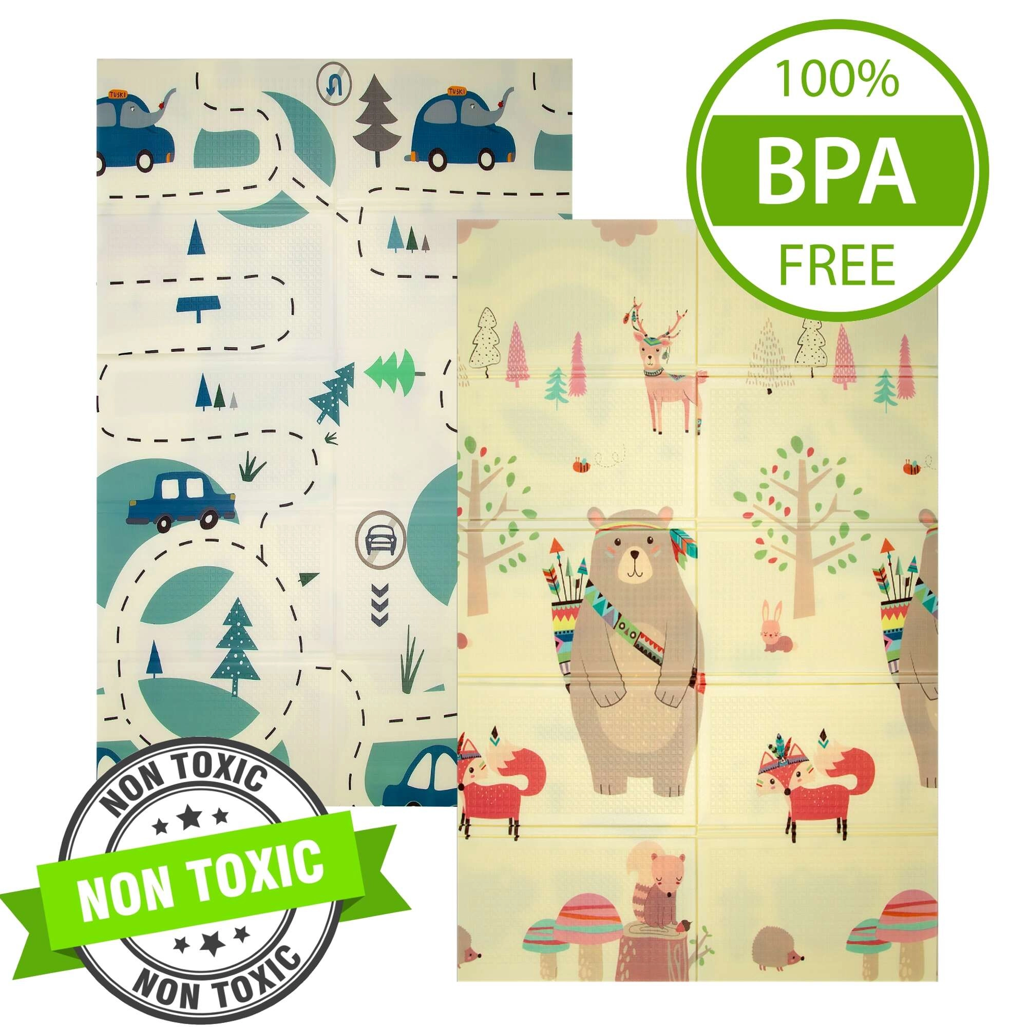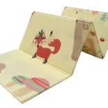 De HUMBI-mat biedt kinderen een zachte en veilige plek om te spelen, te rusten en de motoriek te ontwikkelen. Het hoogwaardige XPE-schuim is stevig, absorbeert schokken en isoleert uitstekend tegen kou vanaf de vloer. Het dubbelzijdige ontwerp toont aan de ene kant lieve bosmotieven (beren, vossen, egels) en aan de andere kant een weg met autootjes voor leuk rijden met speelgoedauto’s en sensorische ontdekking.