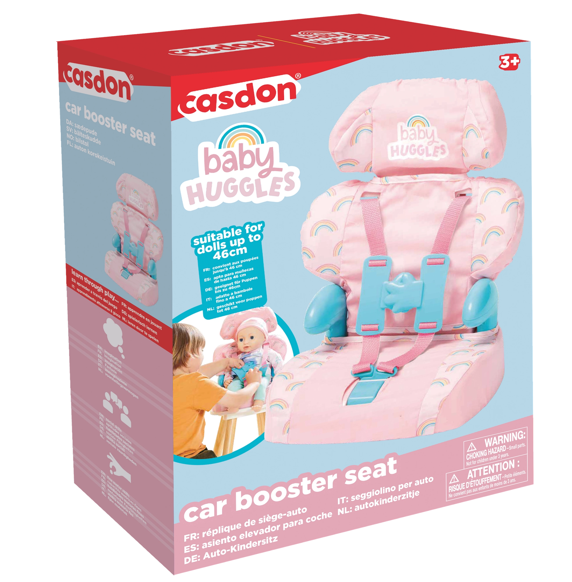 Geef kinderen realistisch speelplezier met het autostoeltje voor poppen BABY HUGGLES van CASDON. De zitting in roze‑regenboogdesign heeft een heerlijk zachte bekleding, comfortabele armsteunen en verstelbare bandjes met een eenvoudige gesp, zodat de pop veilig vast blijft zitten. Dankzij de lichte en stabiele constructie is het gemakkelijk mee te nemen en te gebruiken, zowel thuis als onderweg.