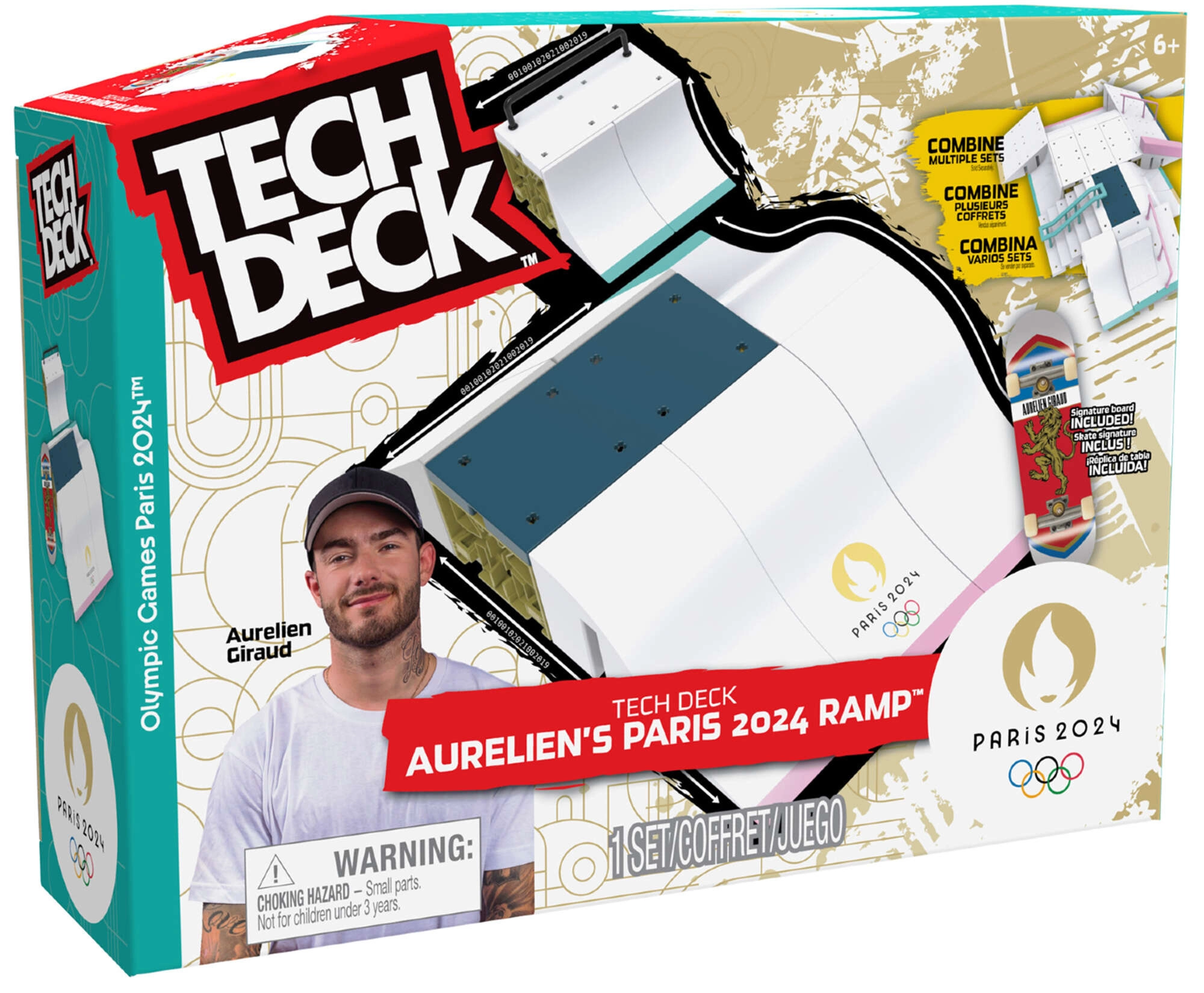 Beleef de sfeer van olympisch skateboarden met de exclusieve Tech Deck Aurelien Giraud Paris 2024-set. Robuuste kunststof onderdelen, kwartbochten, een grind rail en platforms maken vloeiende line-combinaties, ollies, grinds en sprongen mogelijk – allemaal op een gedetailleerd mini-board.