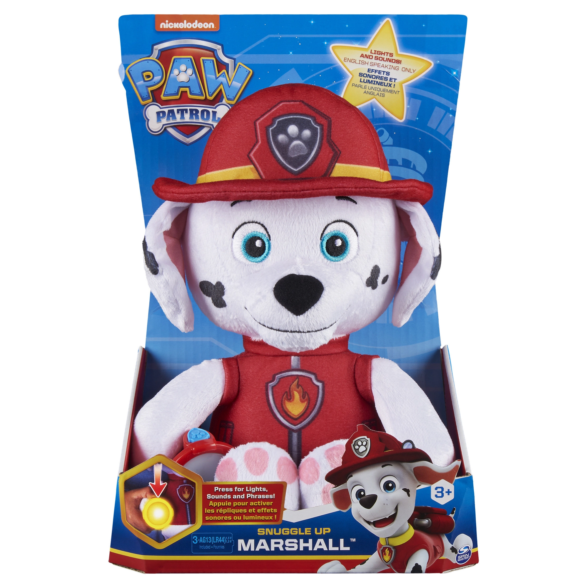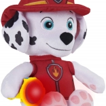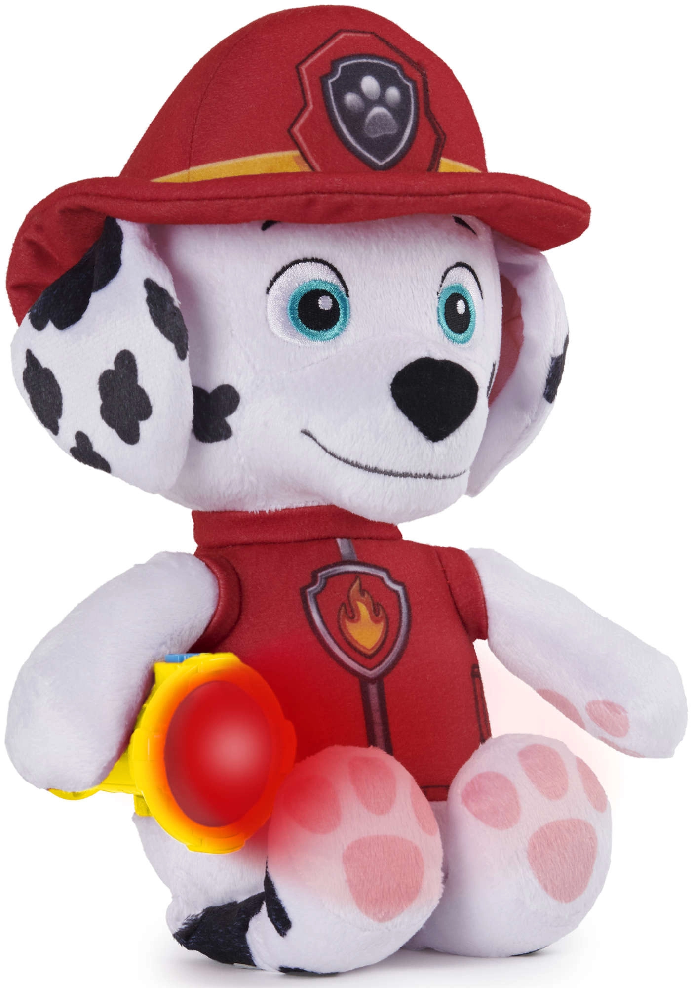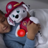 De pluche hond Marshall uit PAW PATROL is een zachte dalmatiër in rode brandweeruitrusting, gemaakt om te knuffelen en om ’s avonds mee in slaap te vallen. Dankzij het licht in de zaklamp en de zachte melodieën verandert hij in een betrouwbare maatje dat kinderen kalmeert bij het inslapen.
