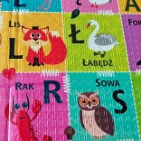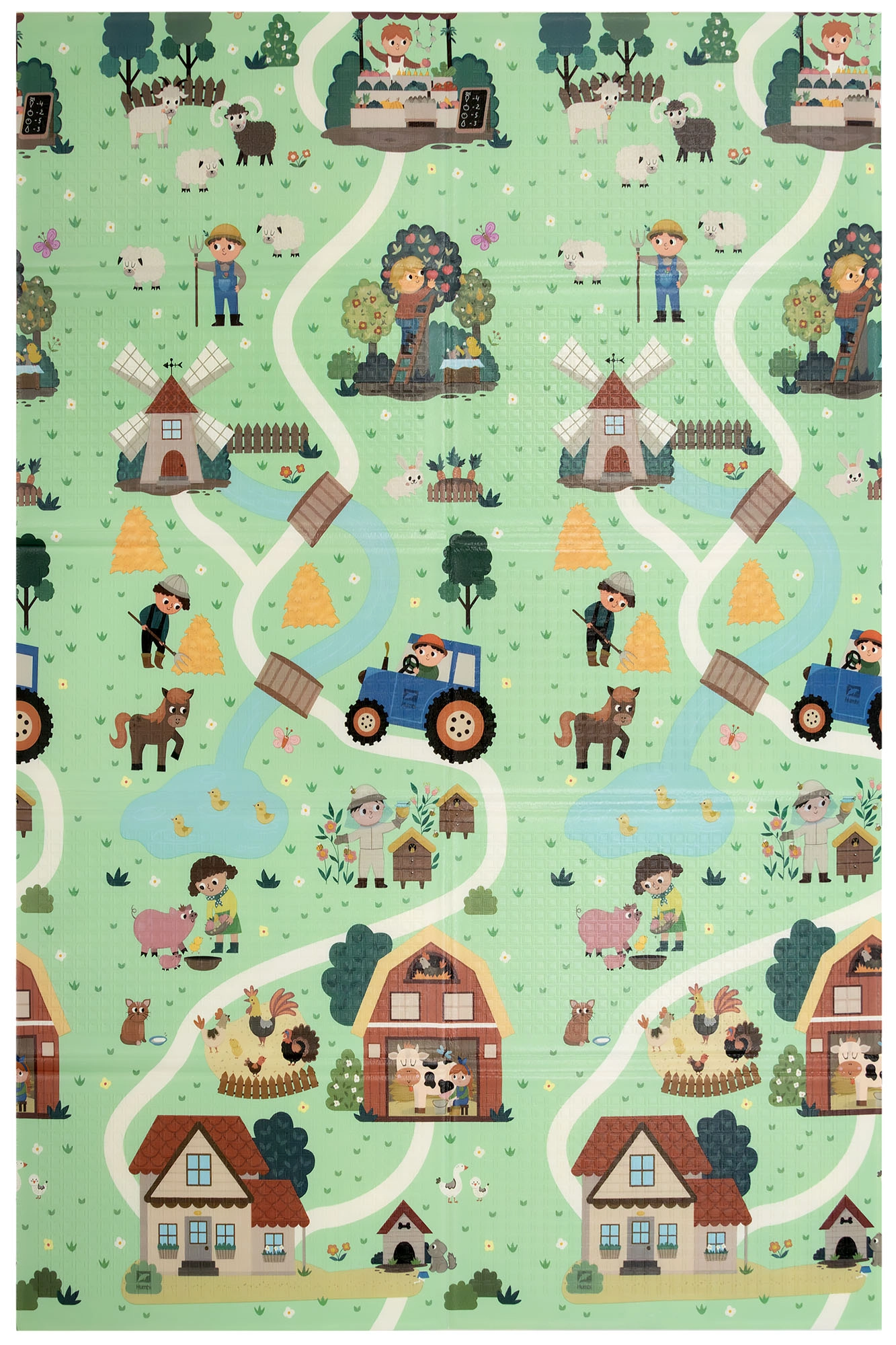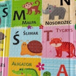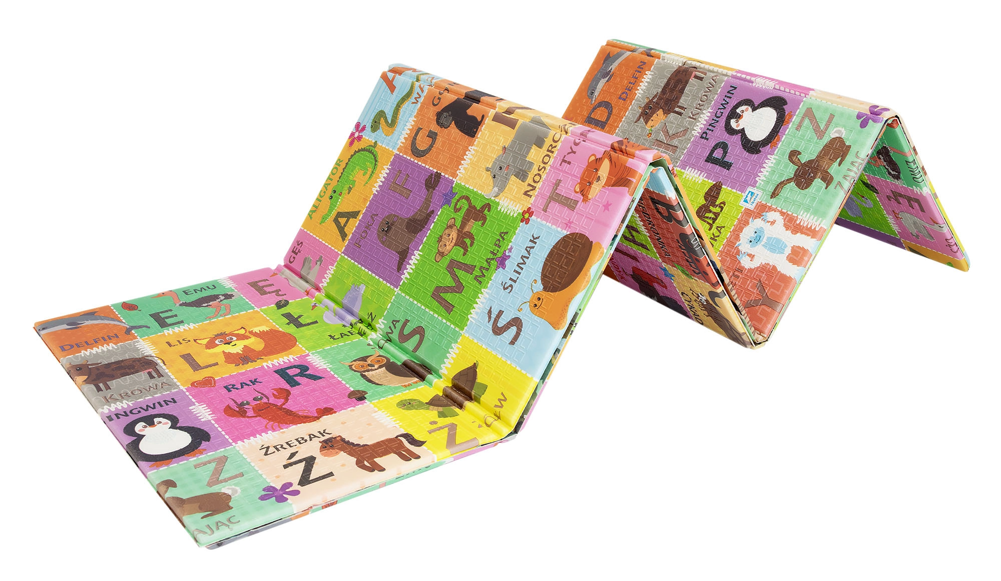 Het dubbelzijdige design stimuleert leren en creativiteit: één zijde met een kleurrijk alfabet en dieren bevordert het herkennen van letters, de andere zijde met een dorp, huisjes en wegen nodigt uit tot fantasierijk spel. De mat is antislip, waterdicht en hygiënisch – afnemen met een vochtige doek is voldoende. Dankzij de opvouwbare constructie vouw je hem snel op, berg je hem eenvoudig op en draag je hem comfortabel met de meegeleverde tas met handvat.