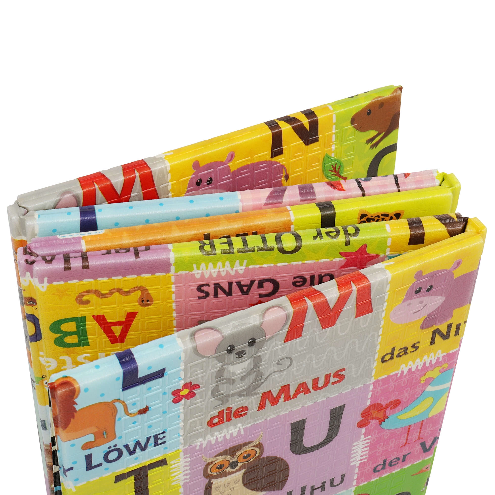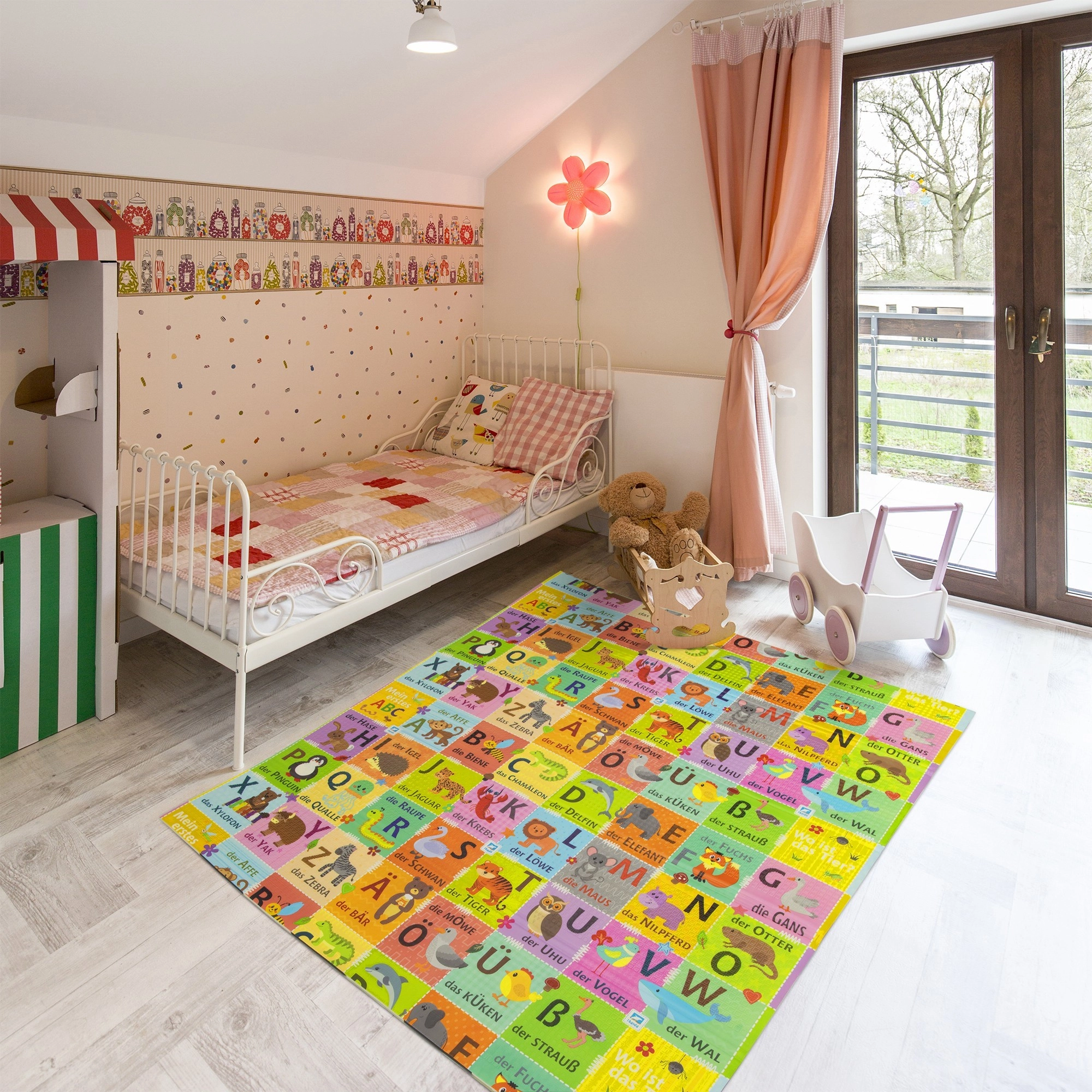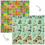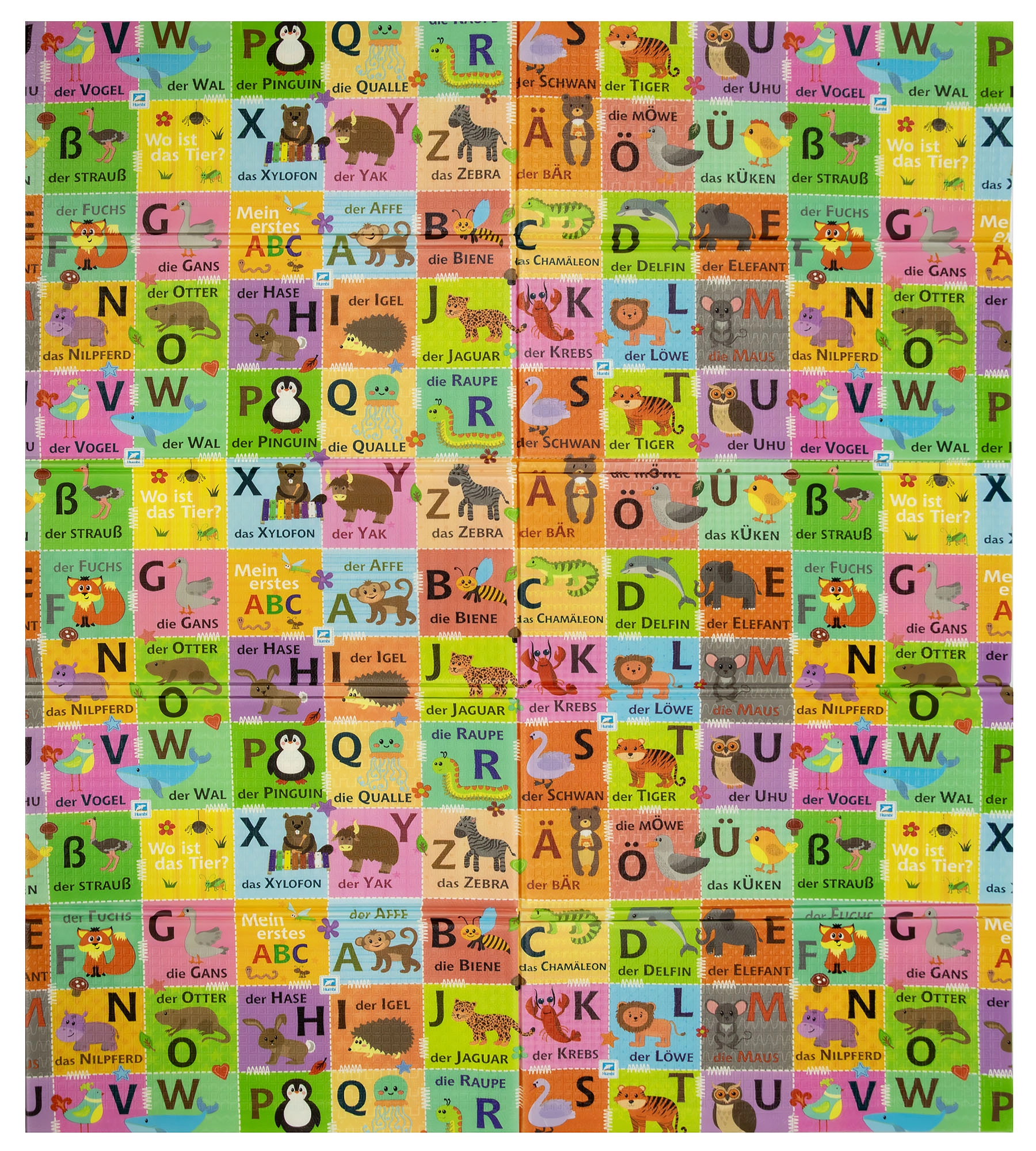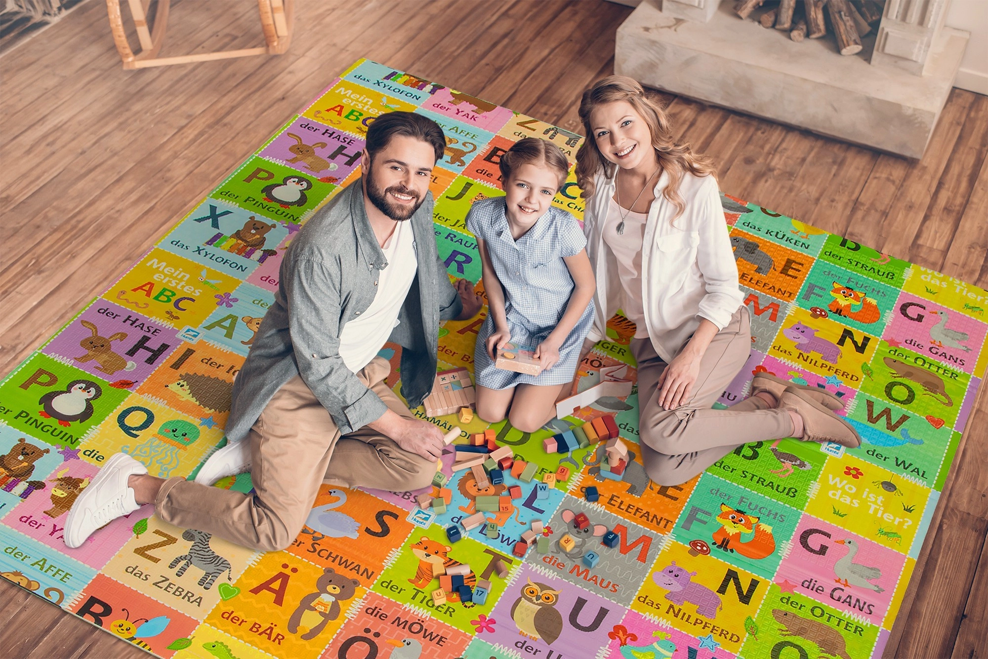 Twee zijden met educatieve graphics stimuleren vroeg leren: de ene toont het Duitse alfabet met dieren, de andere een scène van het leven op het platteland. Dankzij het antislip subtiel reliëfoppervlak is hij veilig voor kruipen en lopen en stimuleert hij de zintuiglijke ontwikkeling.