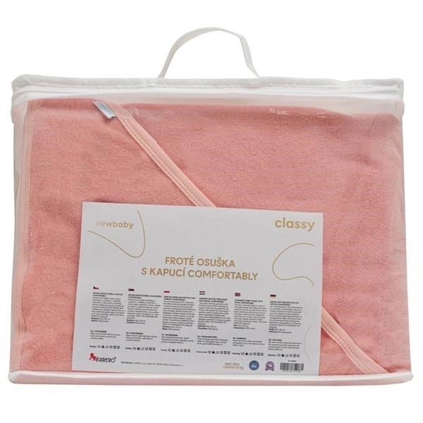 Na het bad is het belangrijk je baby snel en zacht te drogen. De roze capuchonhanddoek NEW BABY Comfortably is gemaakt van hoogwaardig badstof van 100% katoen, heeft een dubbel-laagse constructie voor hogere absorptie en lange levensduur, en een capuchon die tegen kou beschermt. Het materiaal verliest geen kleur en irriteert de huid niet.
