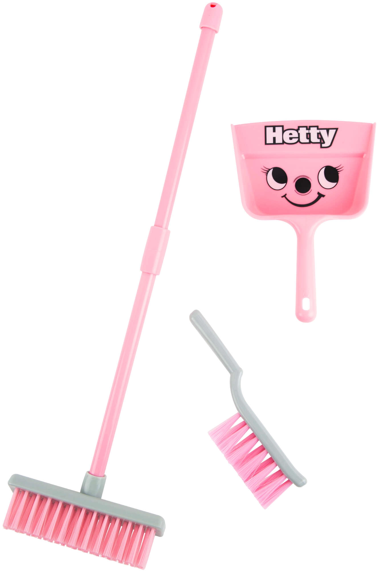 Geef kinderen plezier in helpen in het huishouden met de roze Hetty schoonmaakset. Drie lichte en duurzame kunststof hulpmiddelen – een lange bezem, een compacte handveger en een ergonomische stoffer met de kenmerkende Hetty-glimlach – zijn ontworpen voor kleine handjes en veilig dagelijks spel.