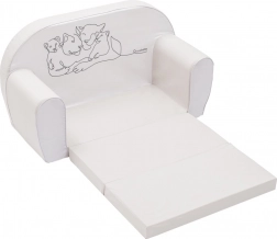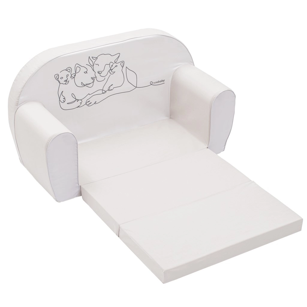 Praktische en comfortabele kinder slaapbank New Baby Lion Family in het lichtgrijs, ideaal voor elke kinderkamer. Gemaakt van zachte en lichte polyurethaanschuim, met een afneembare katoenen hoes met rits voor eenvoudig onderhoud, en versierd met een schattig dinosaurusmotief. Biedt veilig zitten zonder harde onderdelen en is perfect voor rusten, spelen en het kijken van verhaaltjes.