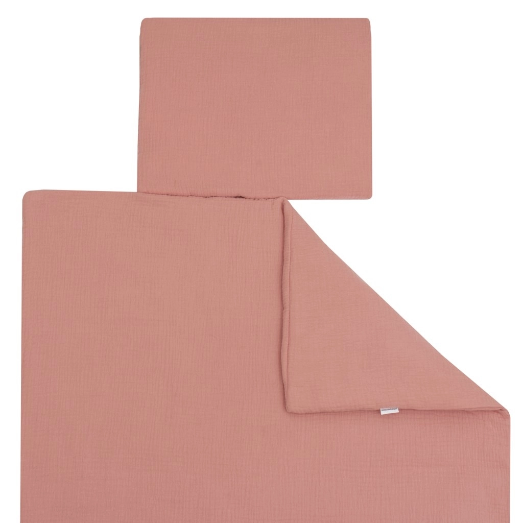 Een zachte mousselineset met vulling voor baby’s, bestaande uit een kussentje en een dekentje in het formaat 70 × 80 cm. Gemaakt van hoogwaardige mousseline en gevuld met anti-allergische vezels, ademend, ultralicht en extra zacht voor de babyhuid. Ideaal voor in het ledikant, de kinderwagen en de gevlochten Mozesmand, met focus op veiligheid, comfort en eenvoudig onderhoud.