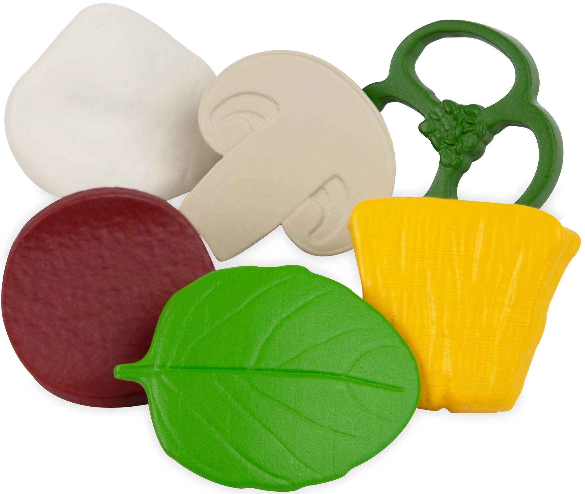 De bodem is verdeeld in 4 stukken voor eenvoudig portioneren en rollenspel met serveren. De stevige, kleurrijke toppings liggen goed in kleine handjes en ondersteunen de fijne motoriek.