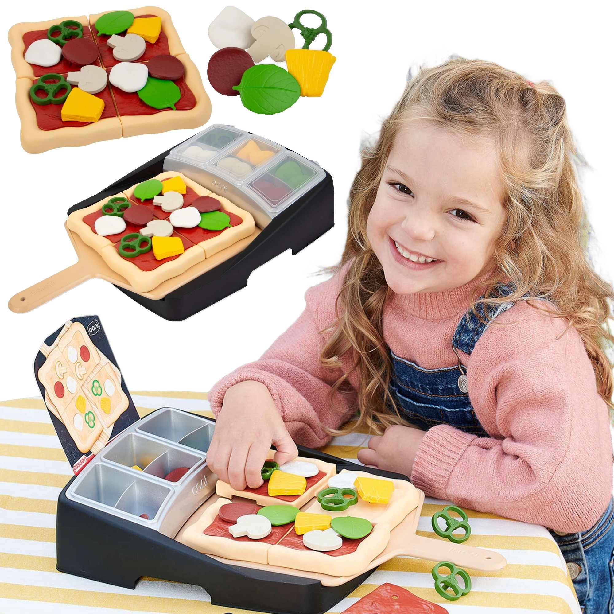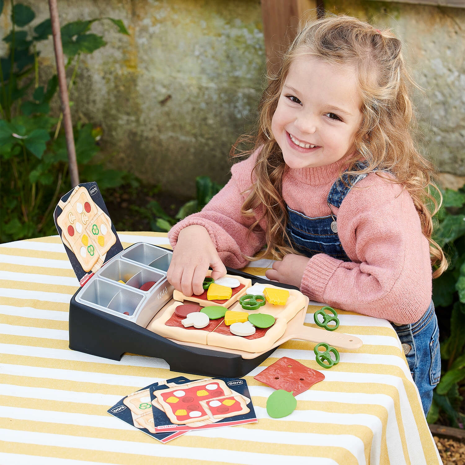Deze moderne kinderset voor pizza brengt realistische pizzabereiding stap voor stap. Dankzij de overzichtelijke vakken voor ingrediënten kiezen kinderen gemakkelijk wat op de pizza hoort en stellen ze volgens de bijgevoegde recepten of hun eigen fantasie de perfecte combinatie samen. Afneembare onderdelen klikken eenvoudig op de bodem en gaan er net zo makkelijk weer af, waardoor je keer op keer kunt spelen.