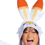Deze witte overall met capuchon is geïnspireerd op Scorbunny uit de wereld van POKEMON. Dankzij de zachte polyesterstof, de praktische voorsluiting en details zoals lange oren en een staart is het kostuum ideaal voor carnaval, schooloptredens en dagelijks verkleden thuis.
