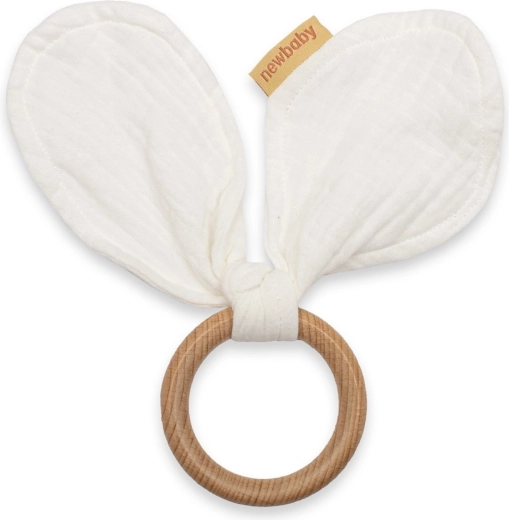 De New Baby Ears-bijtring in het wit is ontworpen voor comfort en het kalmeren van het tandvlees tijdens de groei van de eerste tandjes. De beukenhouten ring is glad en stevig, terwijl de zachte mousseline een prettig gevoel geeft en kan worden gebruikt om speeksel zachtjes af te vegen of mee te spelen.