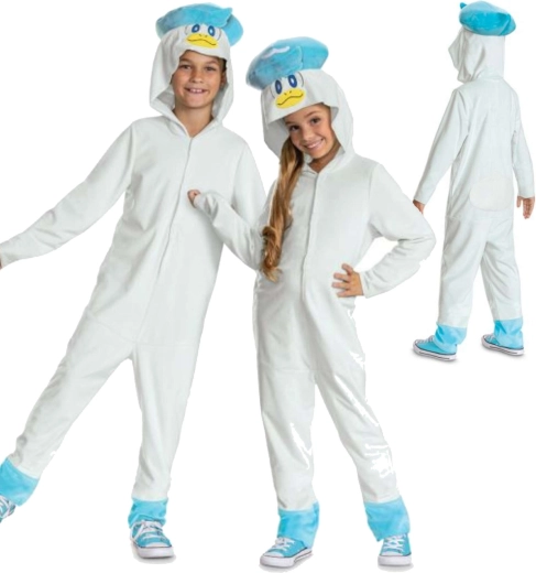 Zacht kinder kigurumi-kostuum geïnspireerd op POKEMON Quaxly biedt comfort, warm materiaal en gemakkelijk aantrekken met rits. Ideaal voor carnaval, thuis spelen en relaxen – kind zet de capuchon met eendengezicht op en verandert in een favoriete water-Pokémon.