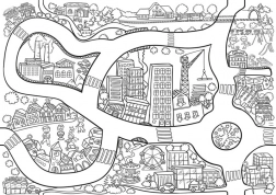 Kleur samen met kinderen op het grote formaat, dat je gemakkelijk op tafel of op de vloer kunt uitspreiden. Als je alle zes motieven verzamelt, verbind je ze eenvoudig tot één grote kaart die met een weg is gekoppeld – perfect als decoratie voor de kinderkamer.
