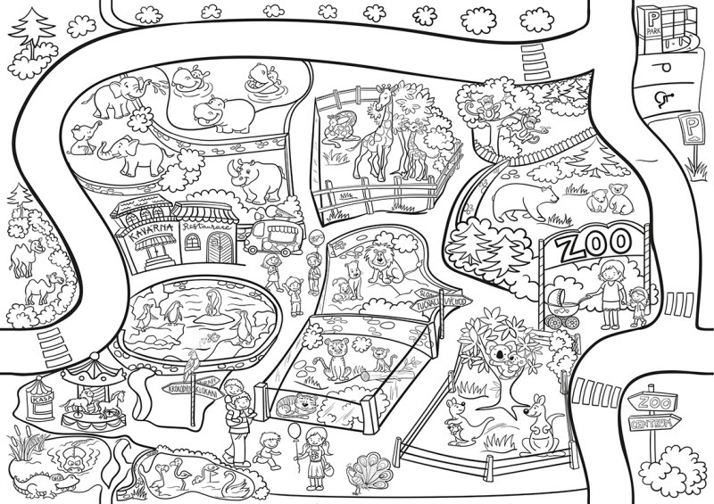 Deze grootformaat kleurplaat Zoo is ideaal voor kinderen en volwassenen die van creatief inkleuren houden. Dankzij het formaat van 64 × 90 cm biedt hij veel ruimte voor fantasie en gedetailleerd inkleuren van de dieren en de omgeving van de dierentuin.