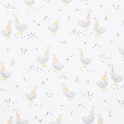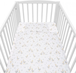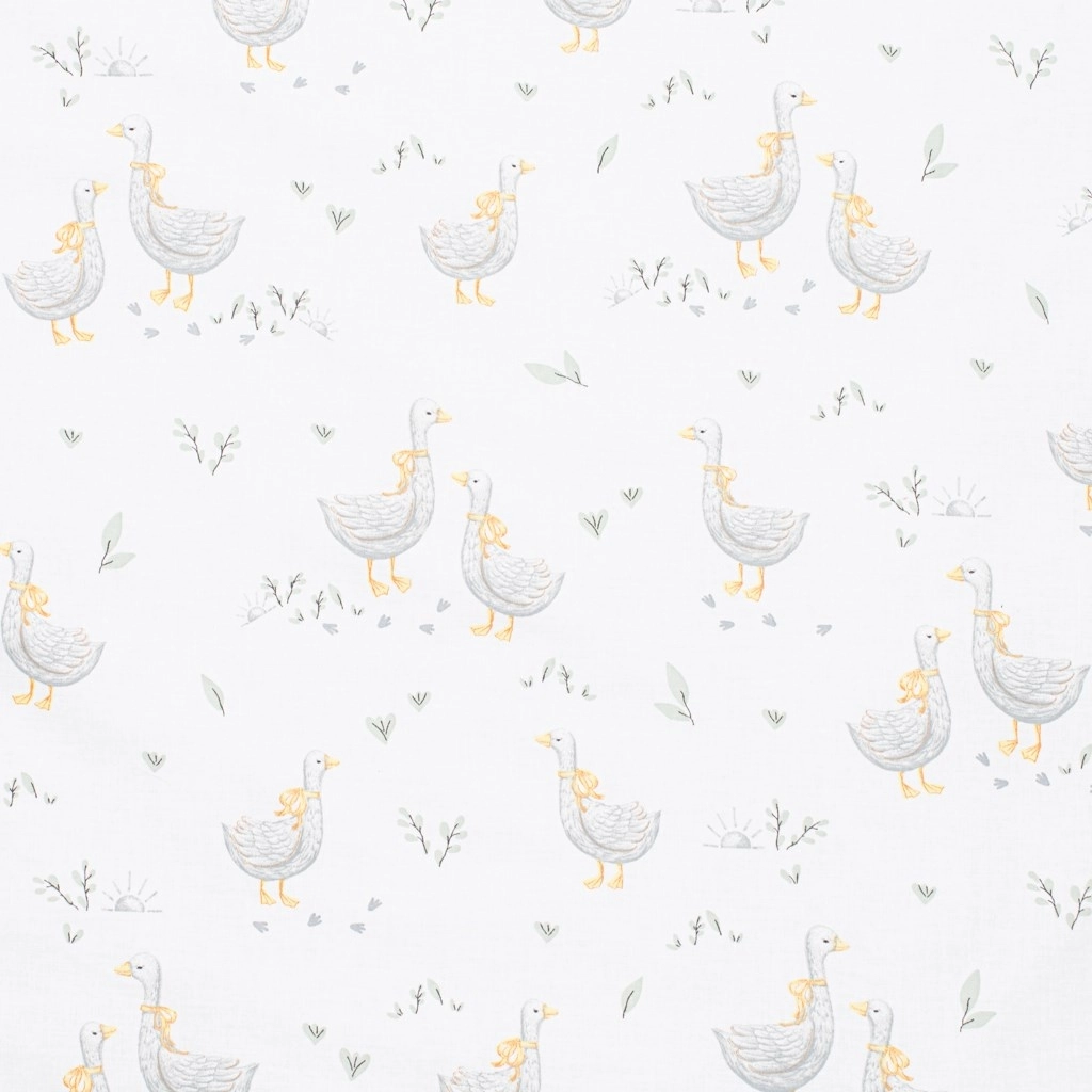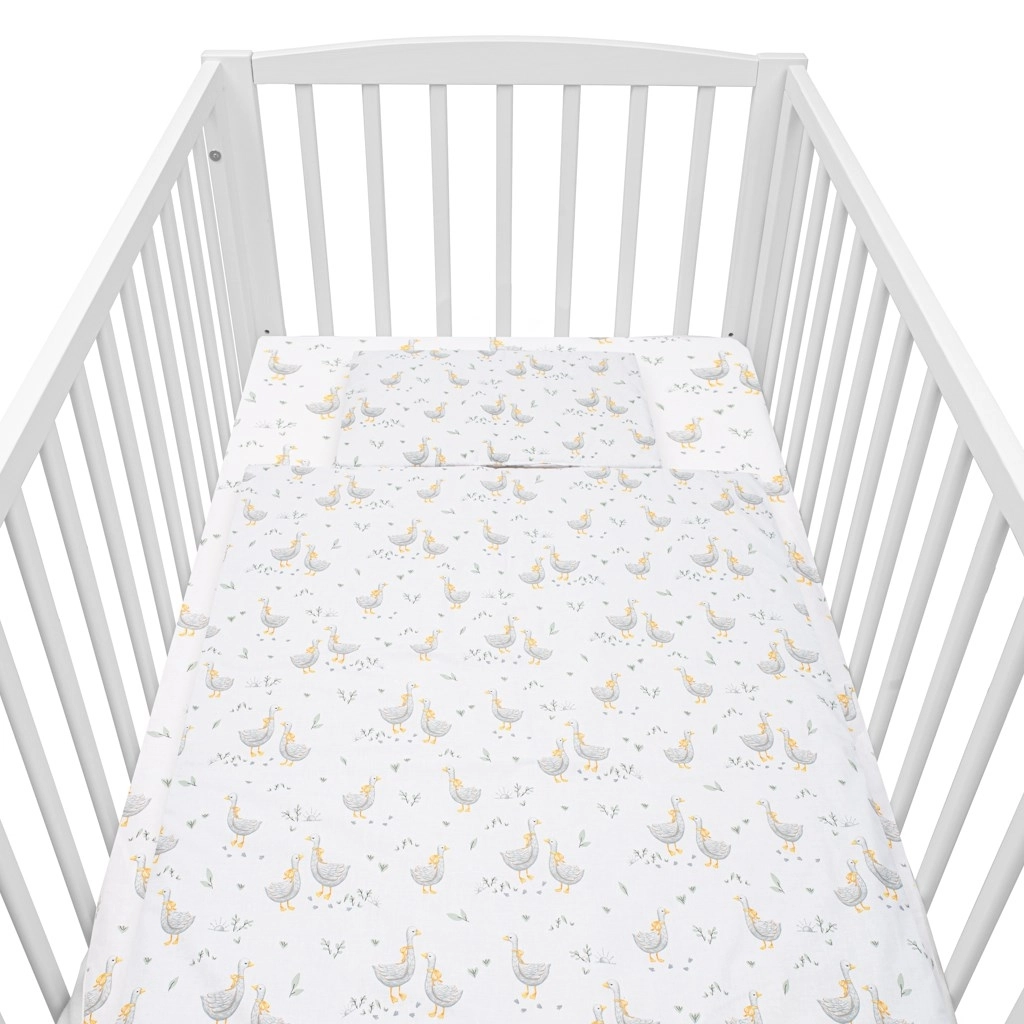De set bestaat uit een kussentje 60 × 40 cm en een dekbed 90 × 120 cm met een rustgevend gansjesmotief. De materialen zijn kleurecht, vrij van schadelijke stoffen en geven niet af. Het onderhoud is eenvoudig – gewoon in de wasmachine wassen. Voor een harmonieus kamertje kun je aanvullende producten uit de Gansjes-collectie bijbestellen.