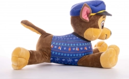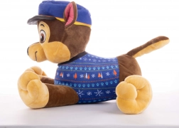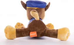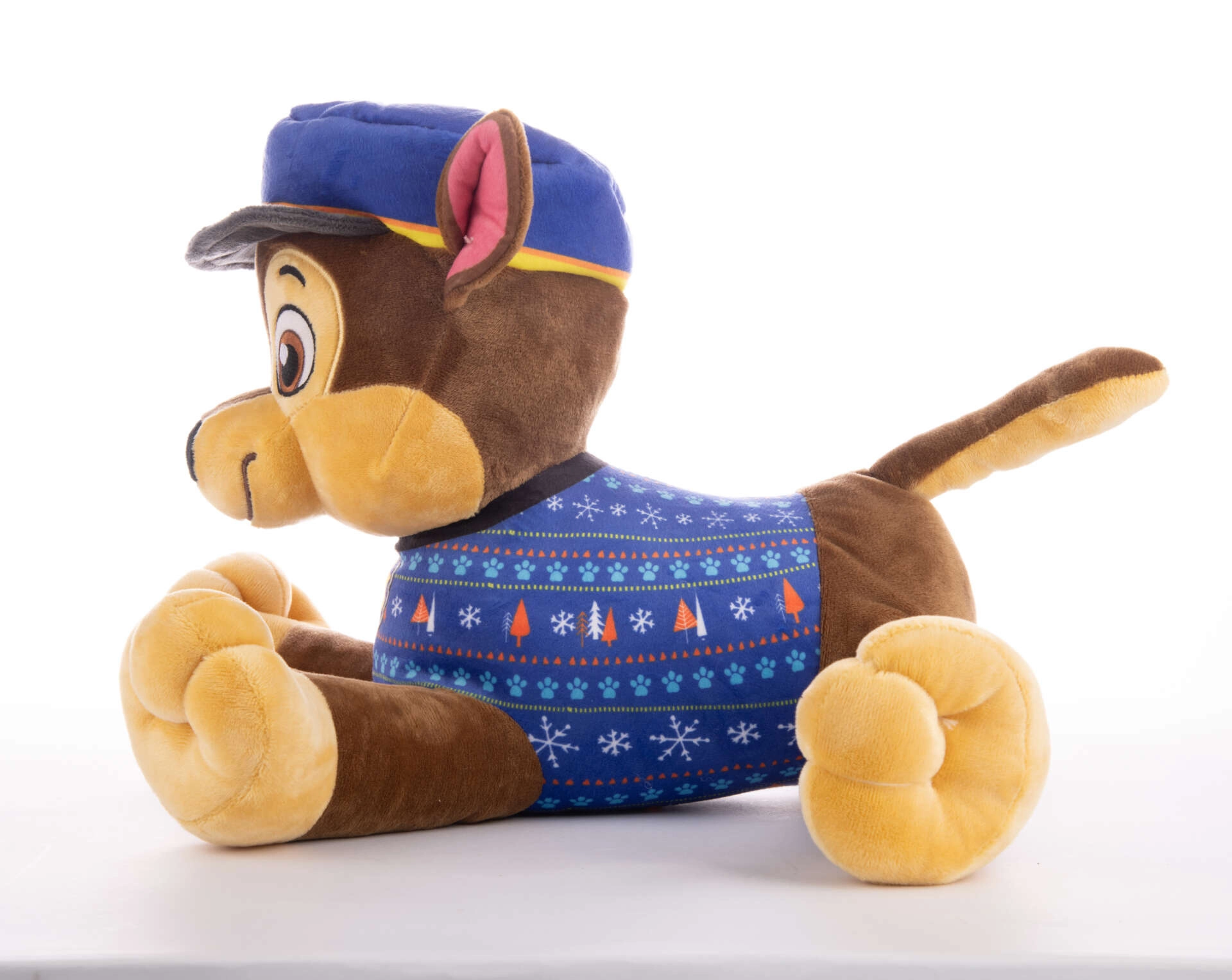 De pluchen politiehond Chase is trouw geïnspireerd op de serie Paw Patrol. Dankzij de grote geborduurde ogen, de blauwe pet en de trui met sneeuwvlokken en boompjes oogt hij maximaal authentiek. De liggende houding met uitgestrekte pootjes maakt hem de ideale partner om te knuffelen, slapen en spelen.