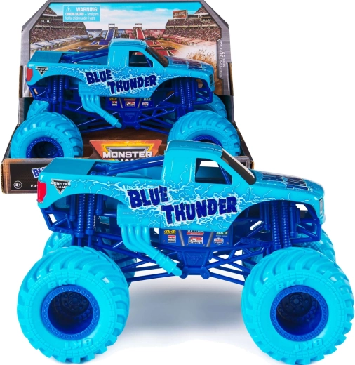 De legendarische Blue Thunder brengt de sfeer van echte MONSTER JAM-races naar de kinderkamer. De metalen carrosserie, opvallende bliksemgraphics en hoge ophanging geven het model een realistische look en duurzaamheid bij sprongen en stunts.