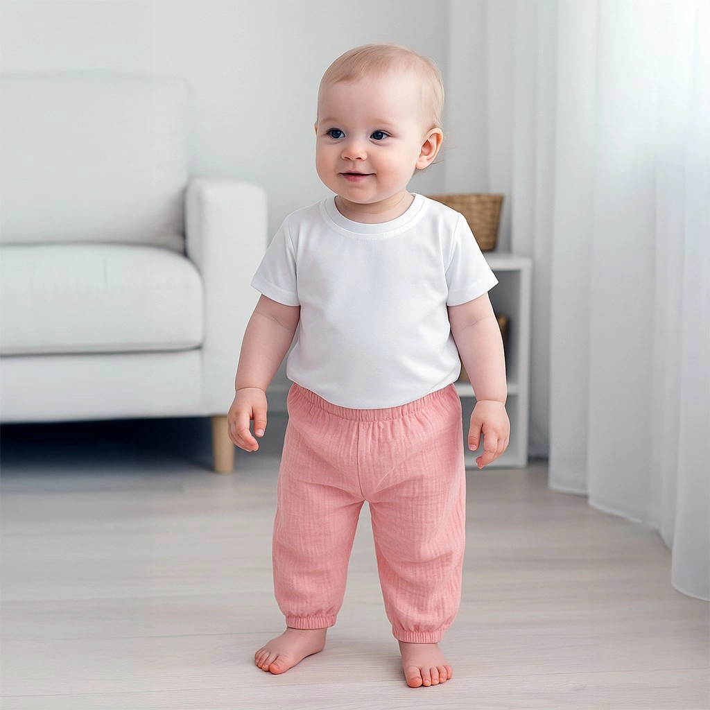 Ontdek comfort en functionaliteit in één. Deze kinderset combineert een zacht katoenen T‑shirt zonder sluiting met een fijne halsboord en moderne, effen mousseline broek met een losse pasvorm. Dankzij het lichte, luchtige materiaal ideaal voor de hele dag dragen thuis, buiten en in de opvang.