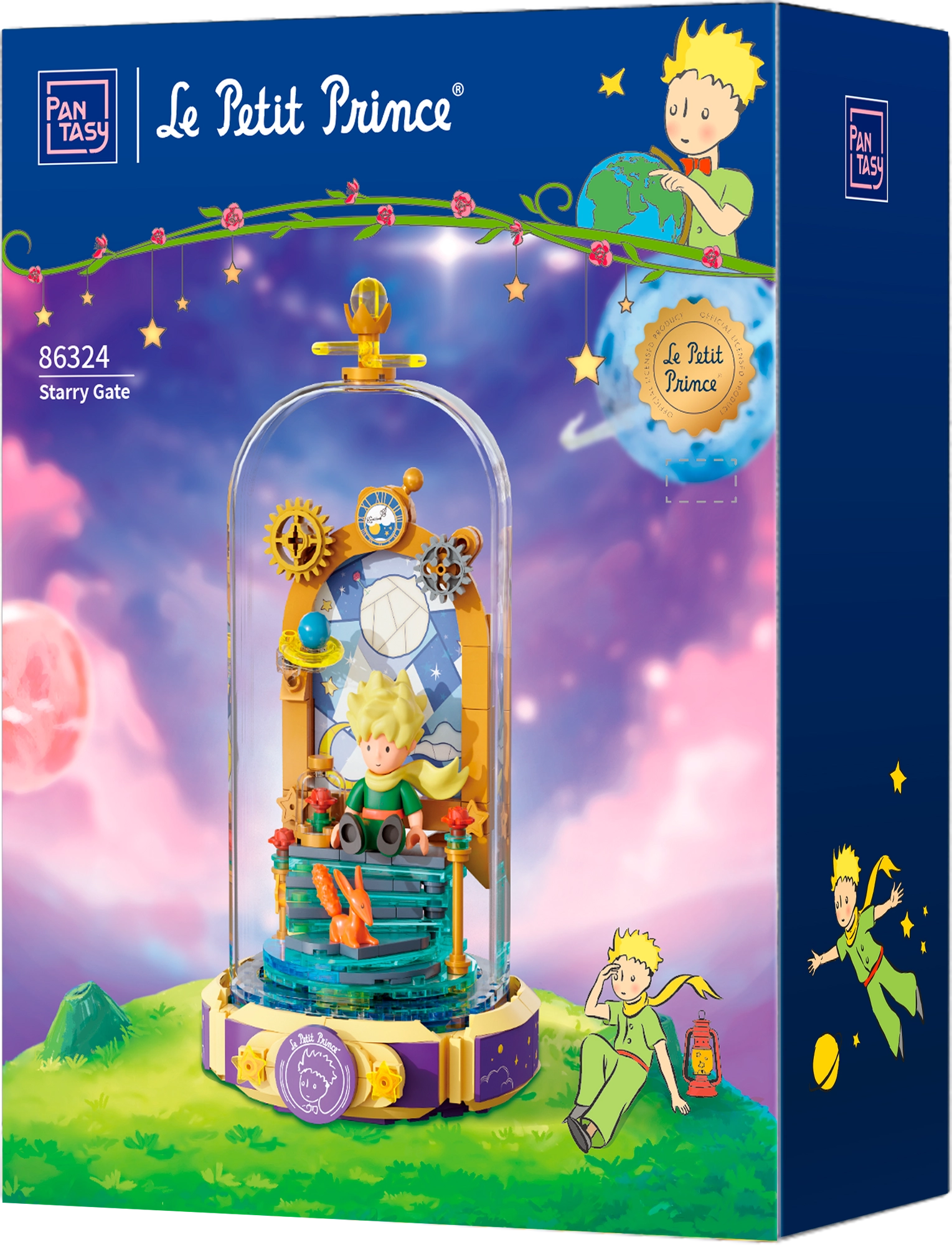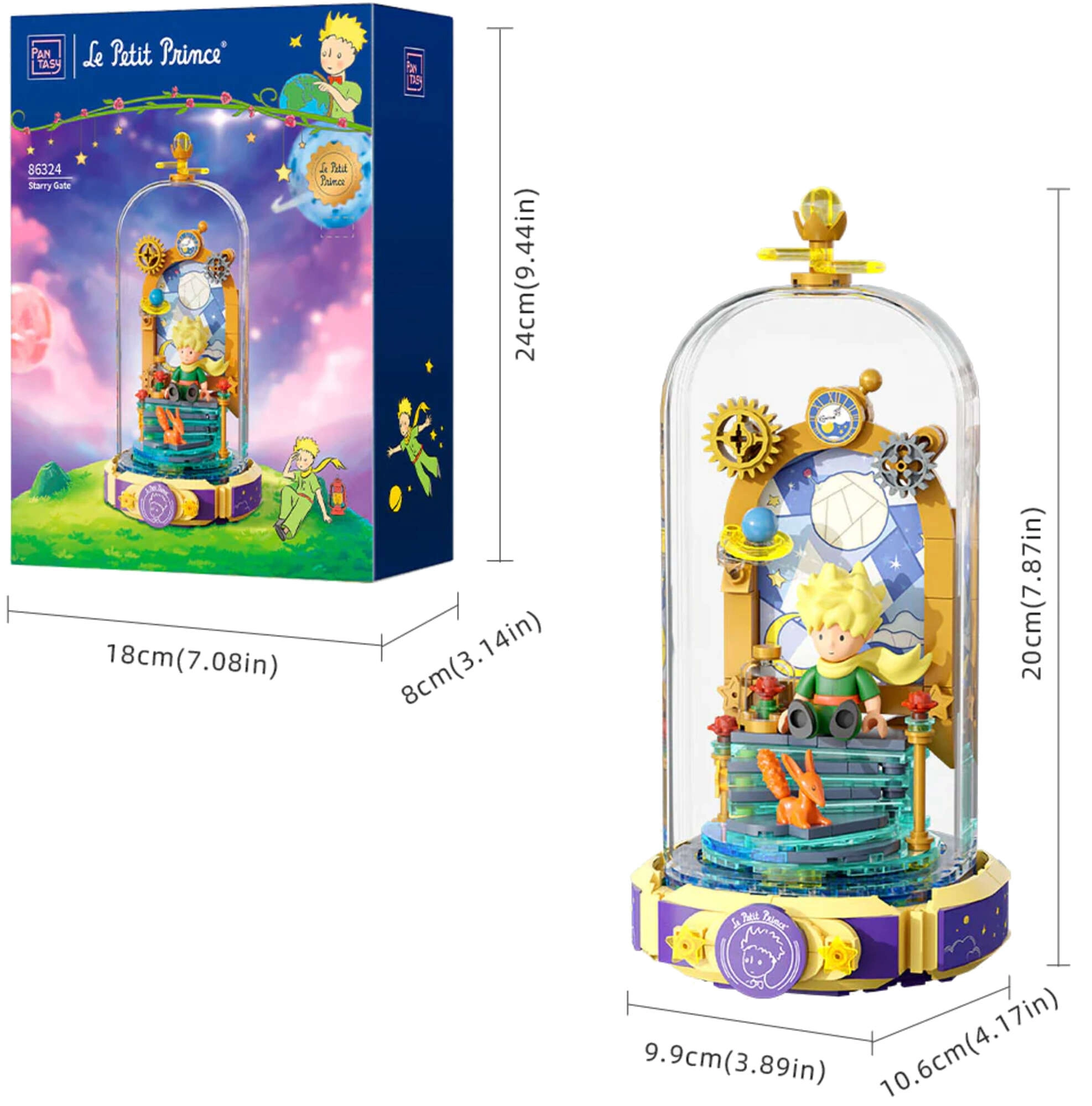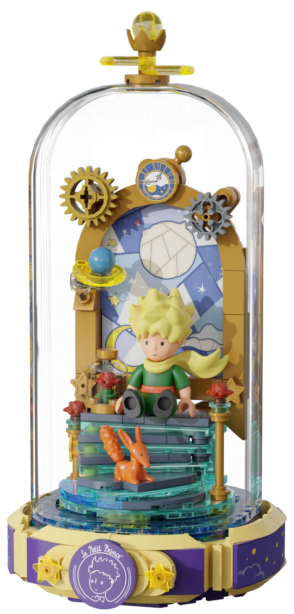 Betreed de poëtische wereld van LE PETIT PRINCE en bouw de scène “Sterrenpoort” met De Kleine Prins en de vos, versierd met gouden sterren, rozen en subtiele ornamenten. De sokkel in de vorm van een open boek met het opschrift “Le Petit Prince” benadrukt de literaire charme van deze tijdloze legende.