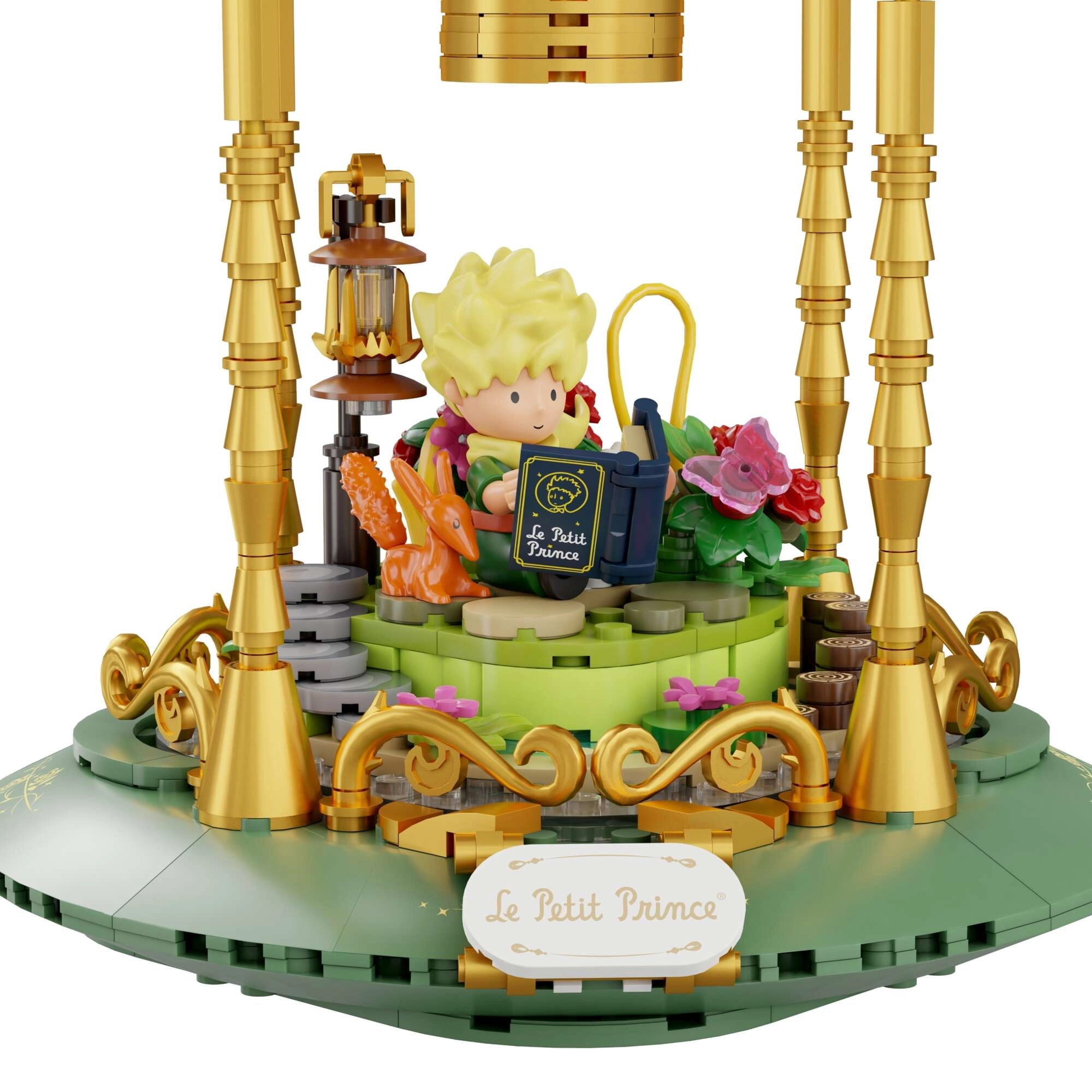 Mini-scenes met de prins, de vos, de roos en sterren vormen een poëtisch verhaal in meerdere lagen. Transparante onderdelen en gouden ornamenten benadrukken het tentoonstellingskarakter van het model.
