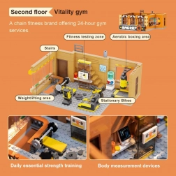 - 1e verdieping – fitness 24/7: zones voor aerobics, vechtsporten, vrije gewichten en spinningfietsen.