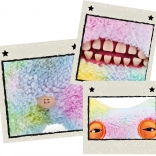 pastelkleurig multicolor, opvallende ogen en tandjes