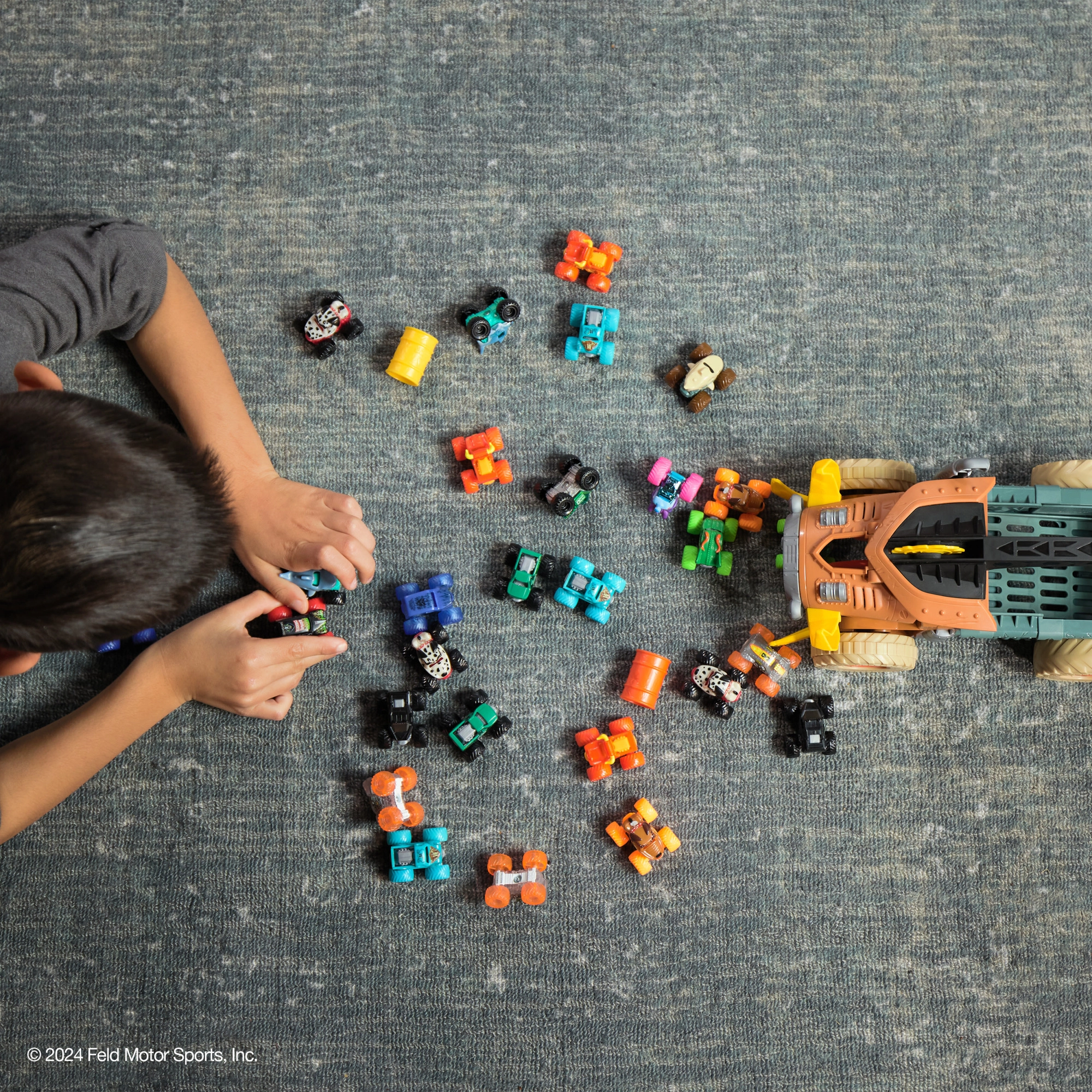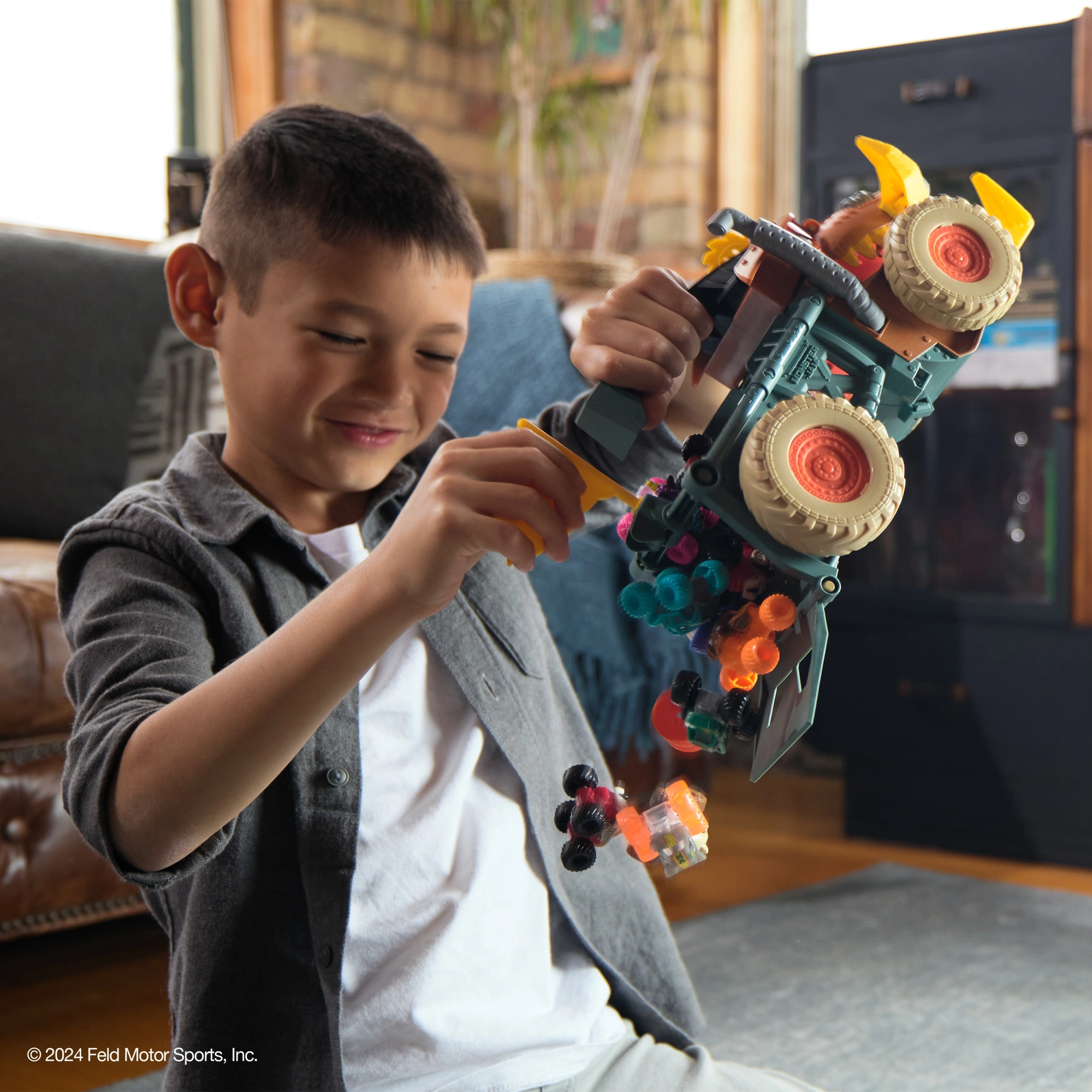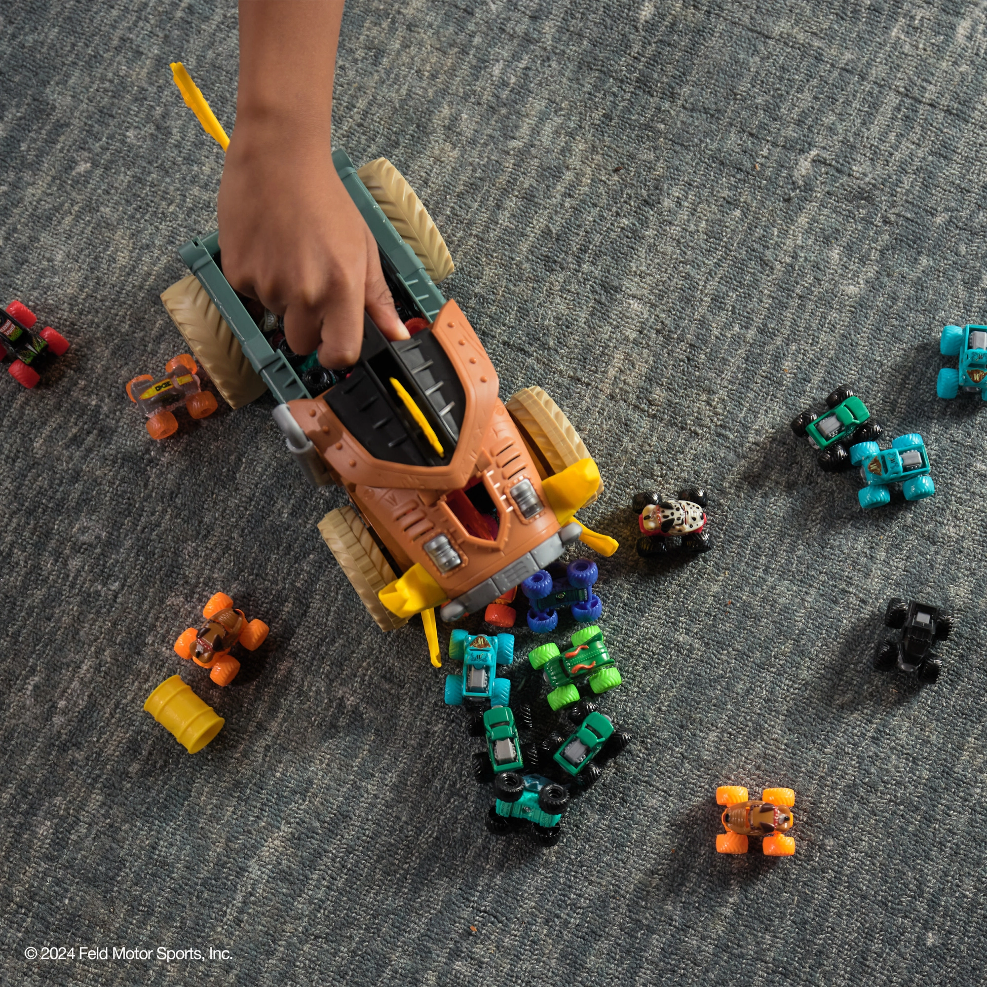 De grote Mad Hog Chomper met een openslaande “bek” en robuuste wielen kan de mini-Megalodon-truck en accessoires oppakken. Kinderen beleven actievol spel, waarbij ze voertuigen kunnen verzamelen, vervoeren en rechtstreeks in de Chomper kunnen opslaan – een geweldige manier om te motiveren tot opruimen na het spelen.