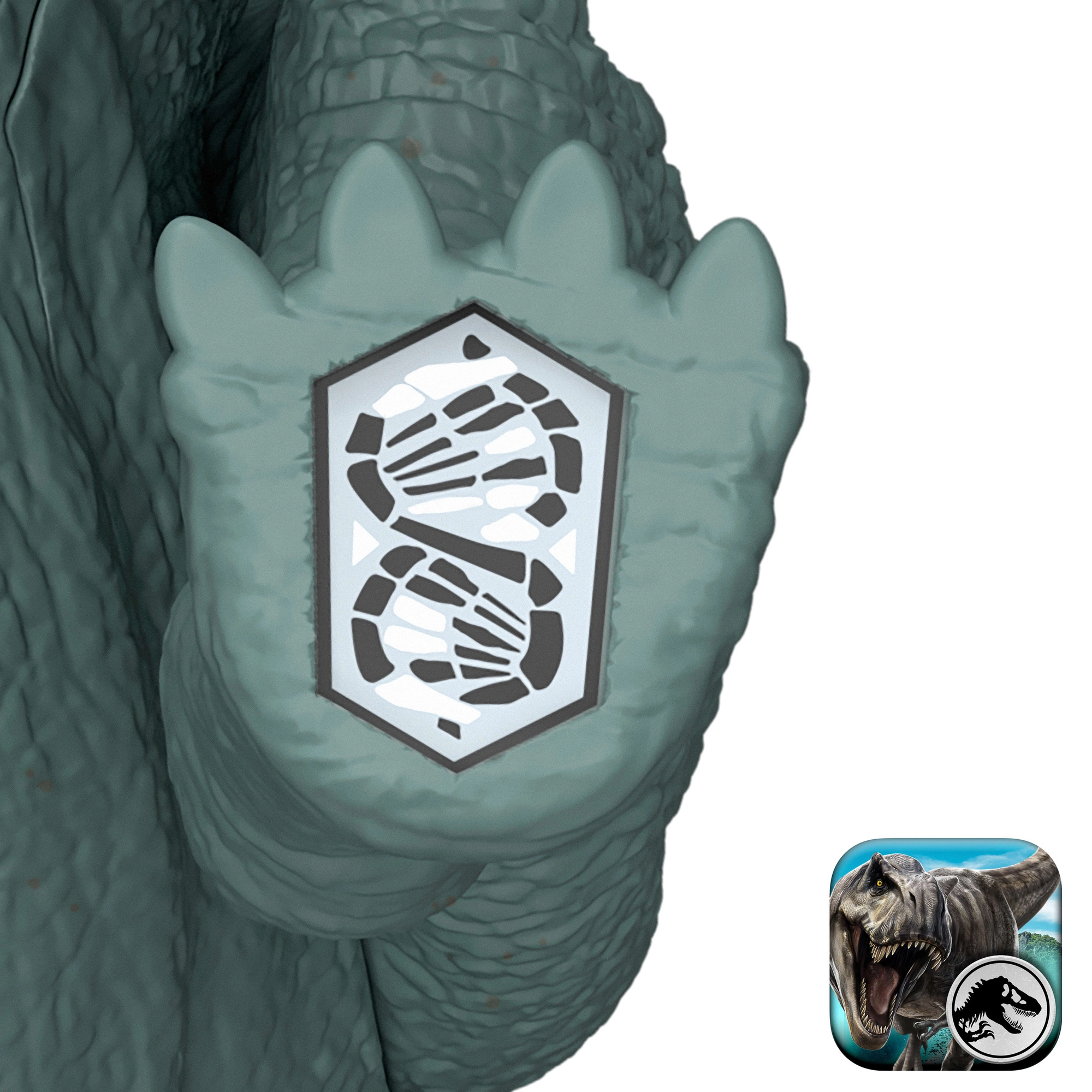 De verborgen DNA-code op de poot van de figuur kan worden gescand in de gratis app Jurassic World Reborn: Facts (Android/iOS). In de AR-omgeving verken je een skeletonderdeel in röntgenmodus, thermisch zicht en educatieve content, en geniet je van minigames zoals racen met dinosaurussen of fossielen zoeken.