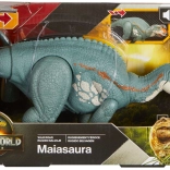 De figuur van Mattel toont de Maiasaura natuurgetrouw met realistische huidtextuur, opvallende kleuren en gedetailleerde afwerking. Dankzij de bewegende gewrichten in de poten, nek en staart stel je eenvoudig dynamische poses in, van rustige wandeling tot aanval. Het bedienen van de staart activeert een kenmerkende kaakslag en brul, wat realistische speelscènes versterkt.